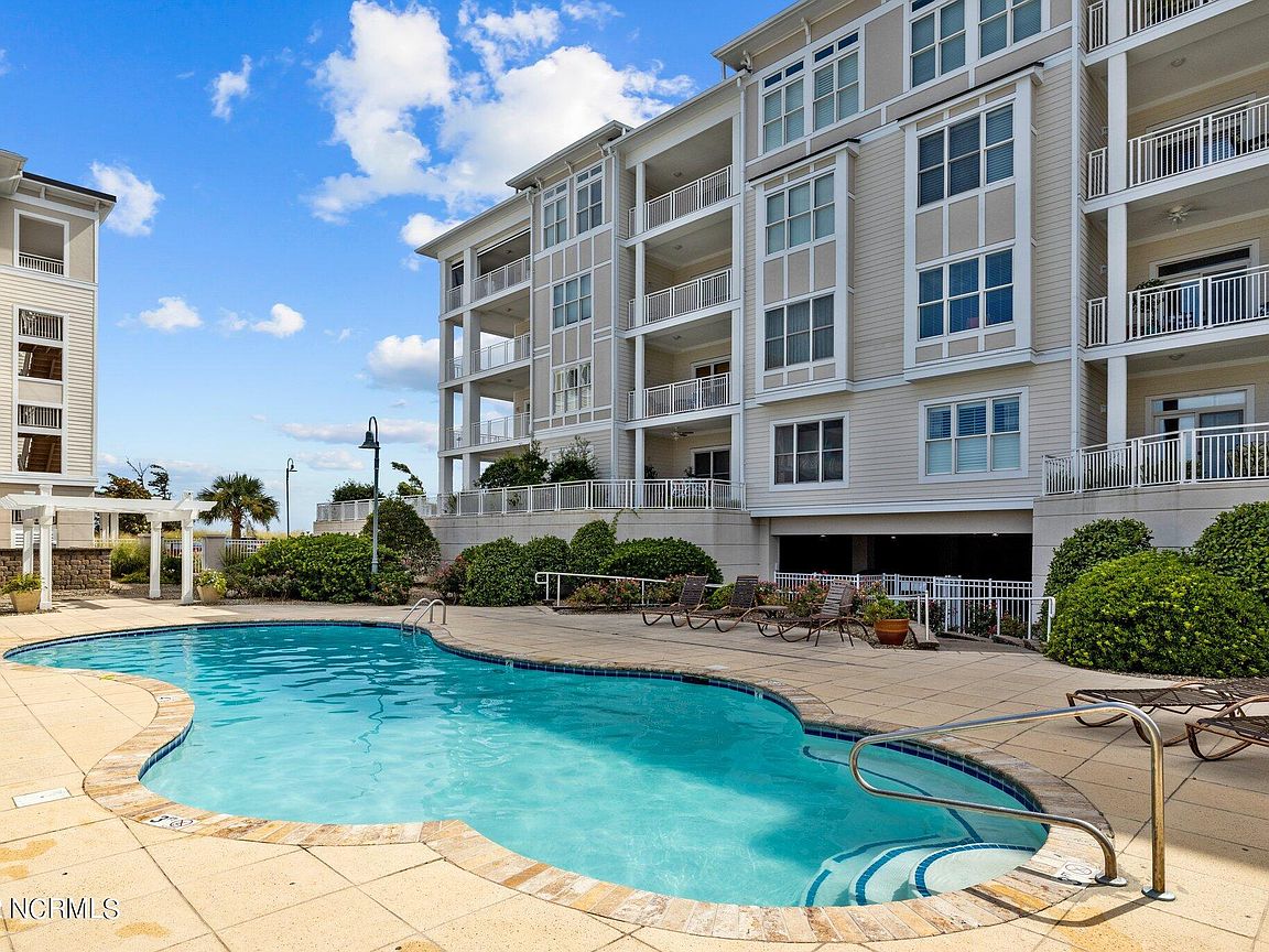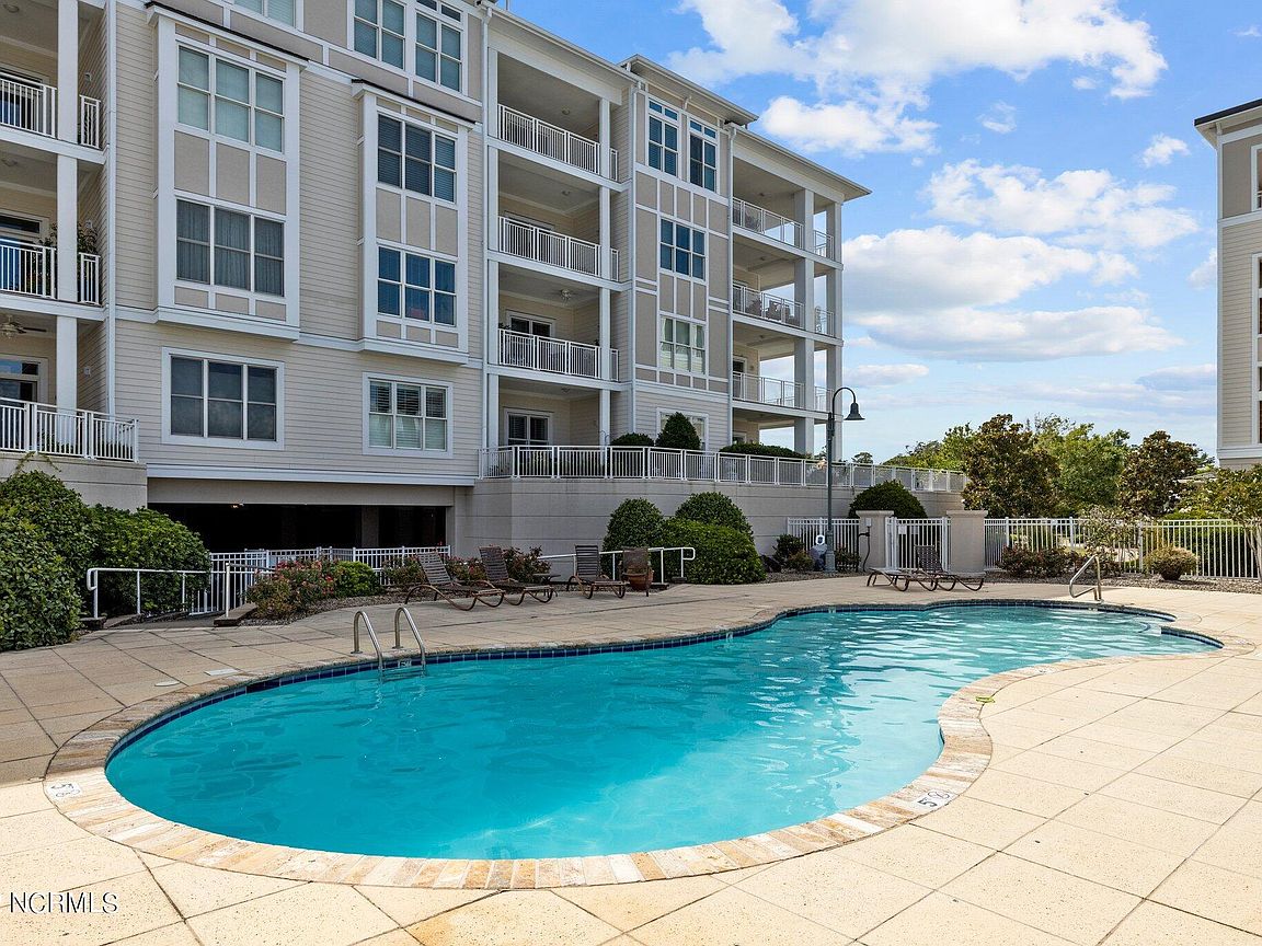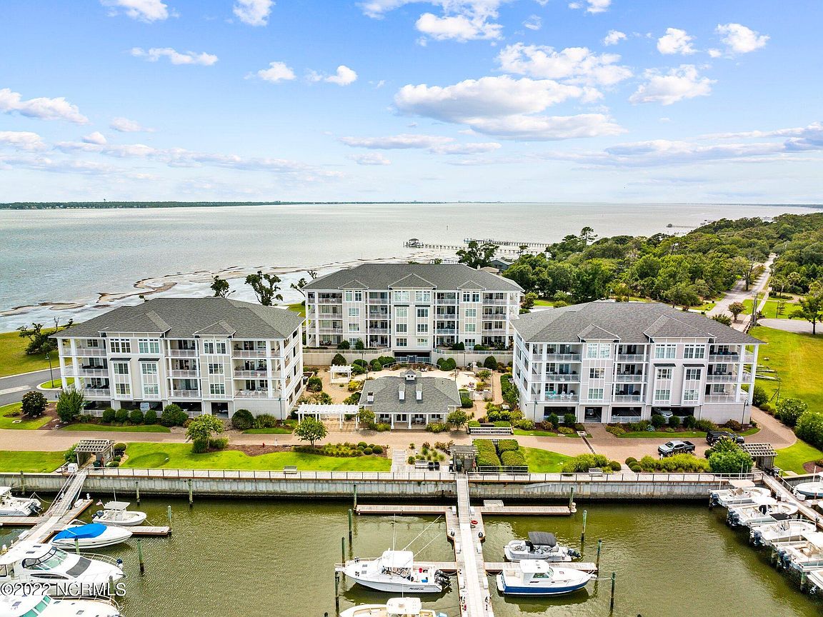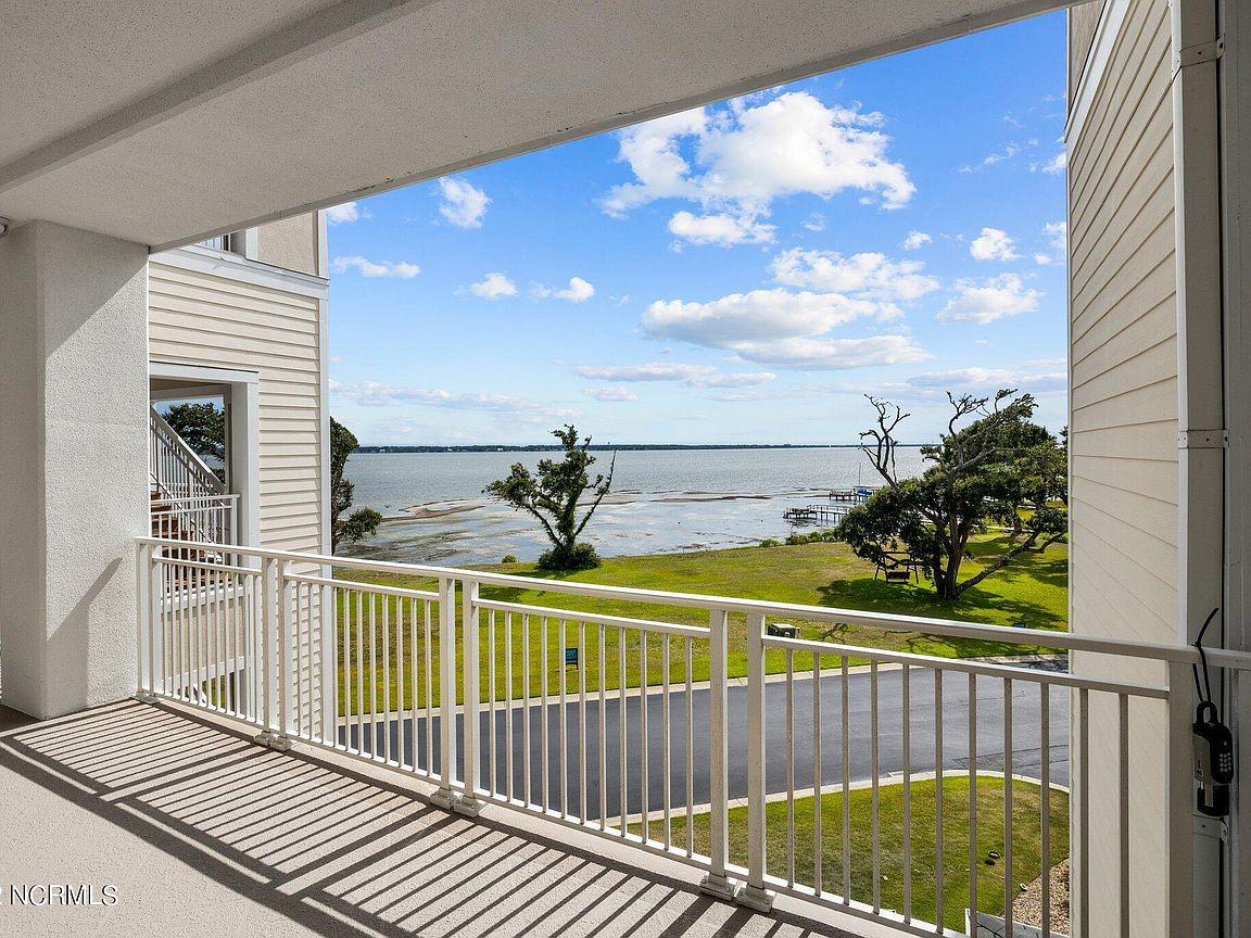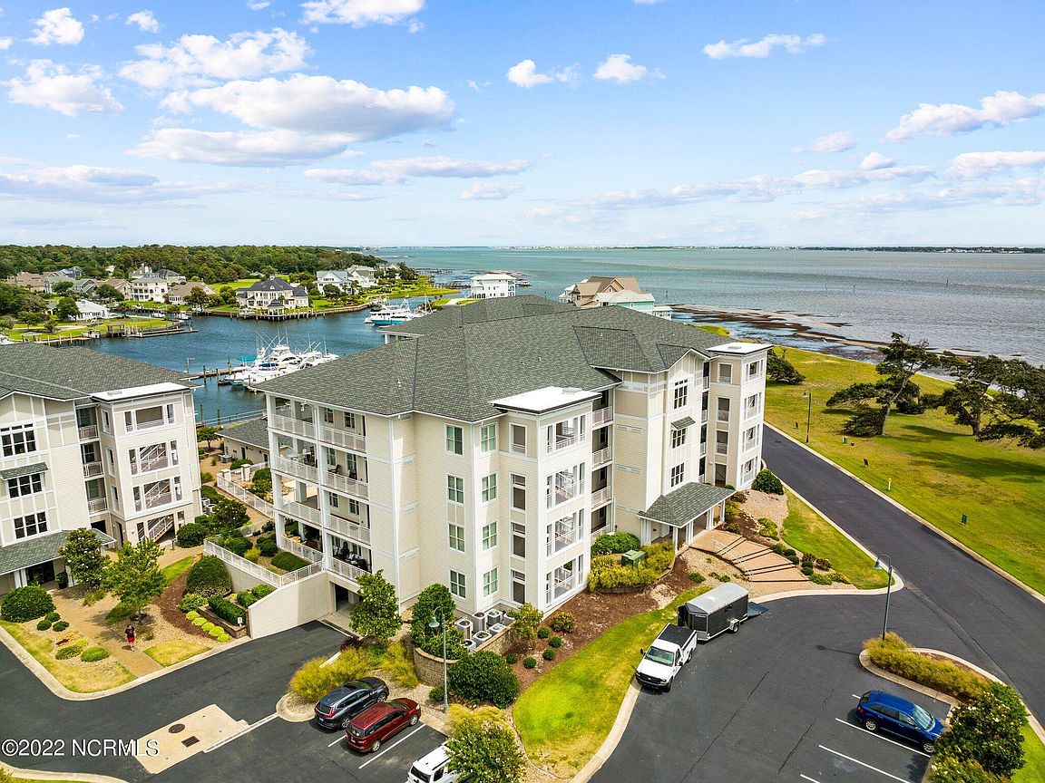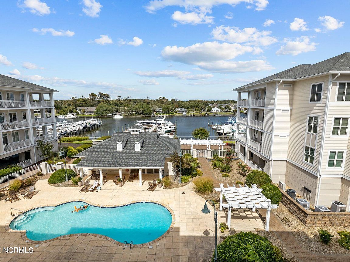 Spacious 3rd floor furnished condo with fabulous view of the pool, water, and marina. Gorgeous view of Bogue Sound from your front door. Lighted trey ceiling in the master bedroom suite. Granite counters, stainless-steel appliances, and abundance of cabinets in this kitchen. 2nd bedroom also has a private bathroom for family and friends' convenience. Custom features abound throughout this condo located in a gated community. Outside storage in located underneath building. Complex is close to shopping, schools, and beaches.