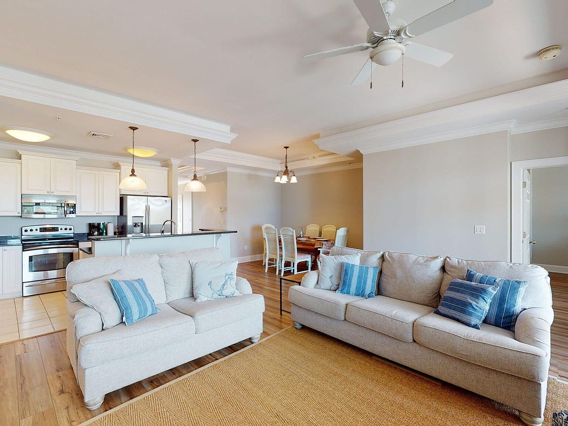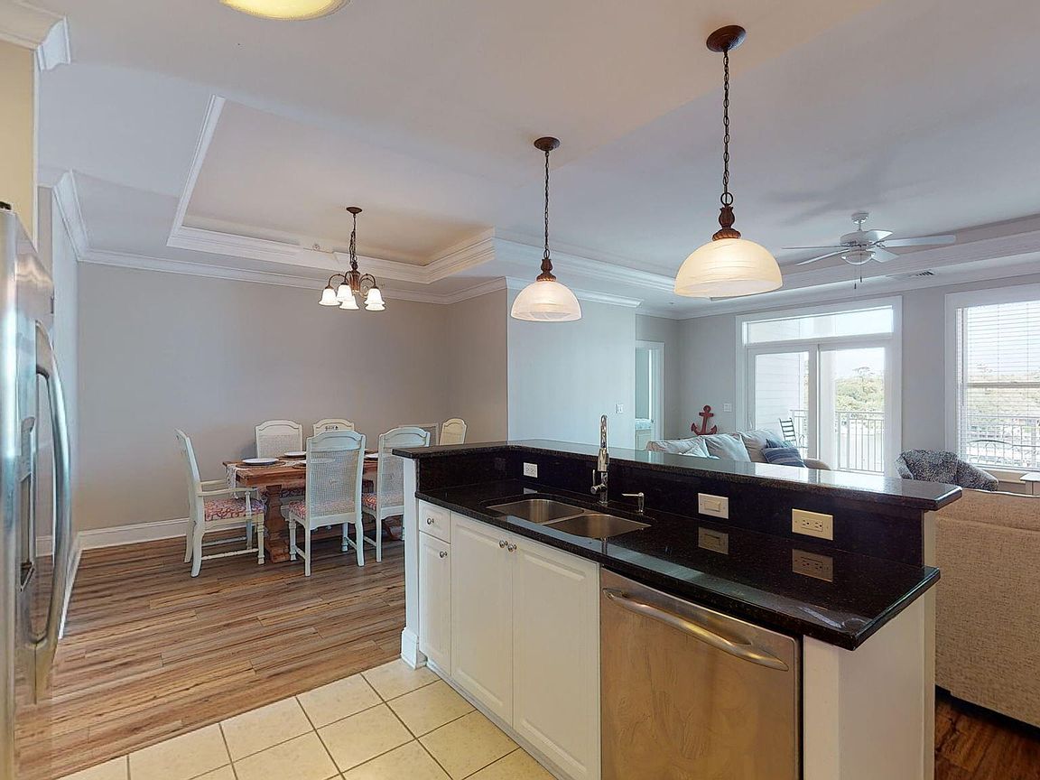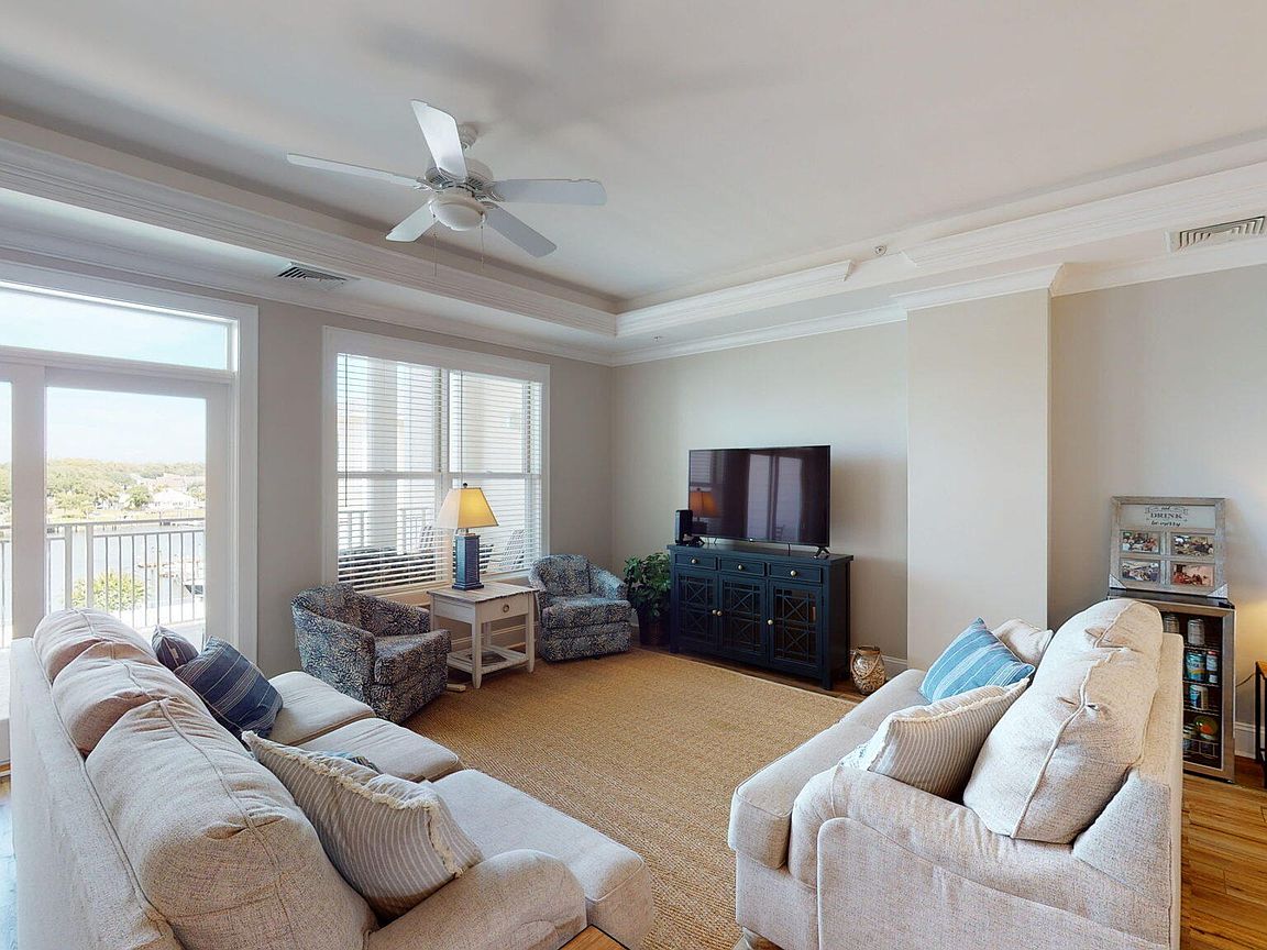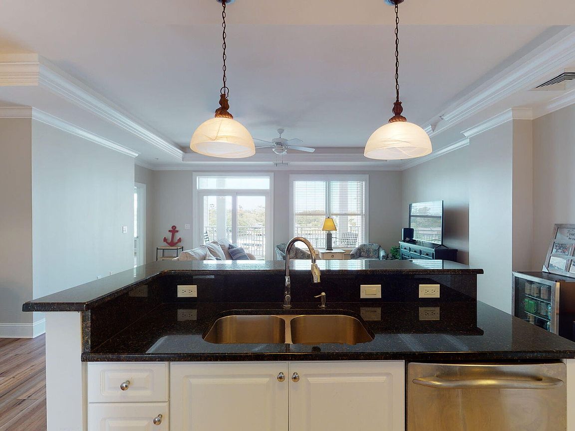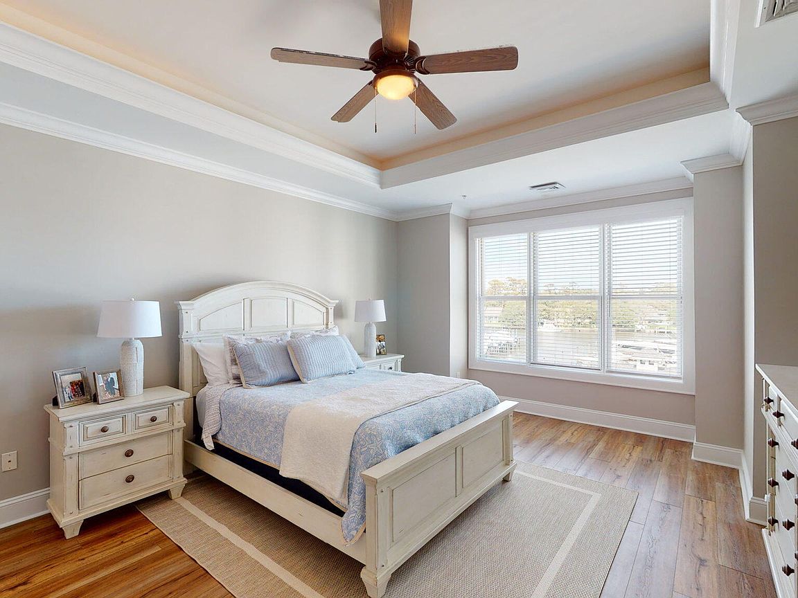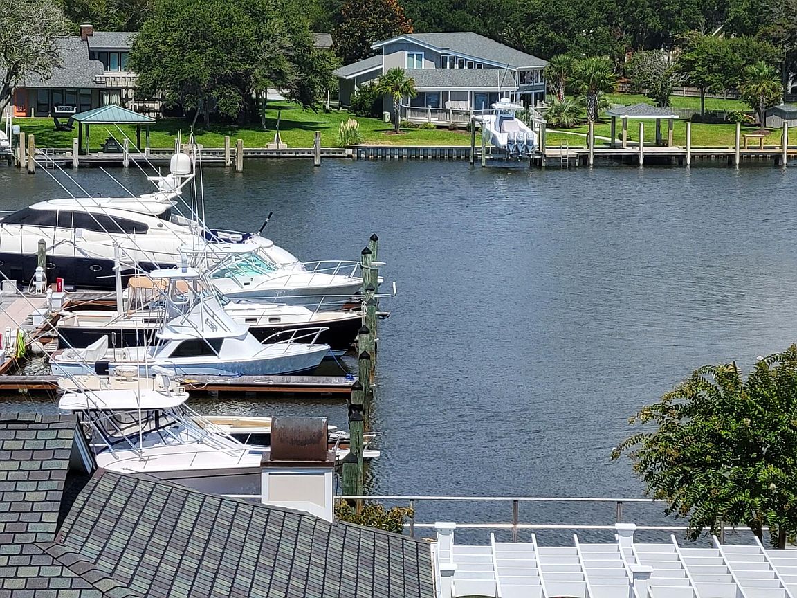 Spacious 3rd floor furnished condo with fabulous view of the pool, water, and marina. Gorgeous view of Bogue Sound from your front door. Lighted trey ceiling in the master bedroom suite. Granite counters, stainless-steel appliances, and abundance of cabinets in this kitchen. 2nd bedroom also has a private bathroom for family and friends' convenience. Custom features abound throughout this condo located in a gated community. Outside storage in located underneath building. Complex is close to shopping, schools, and beaches.