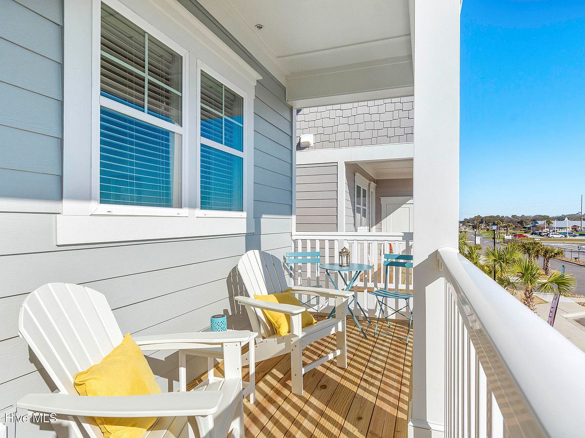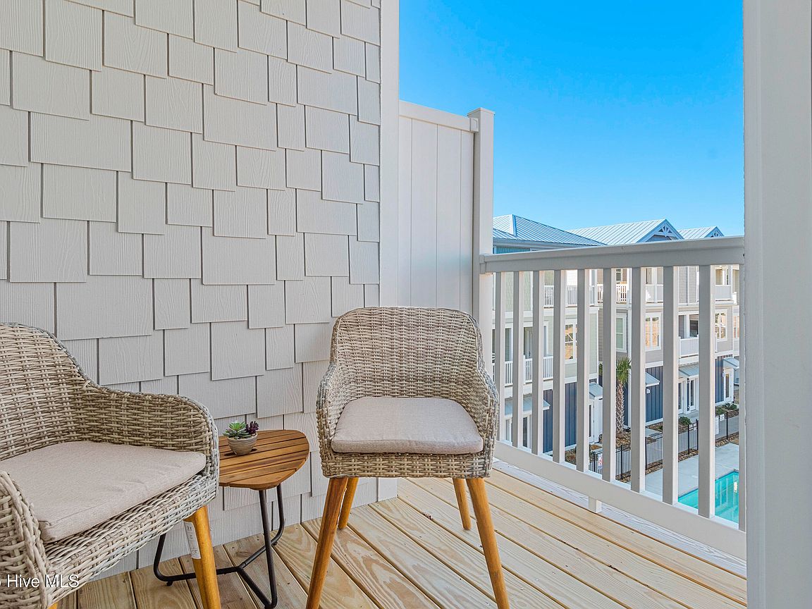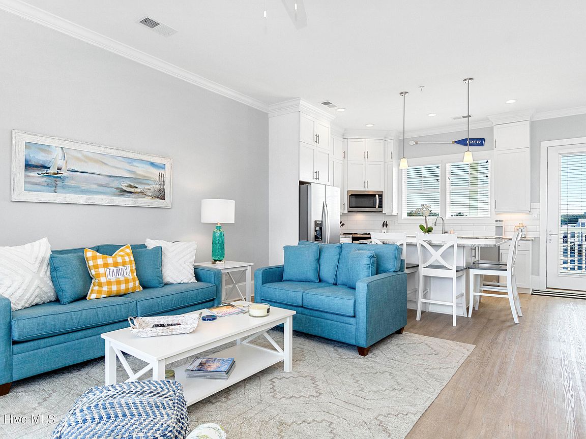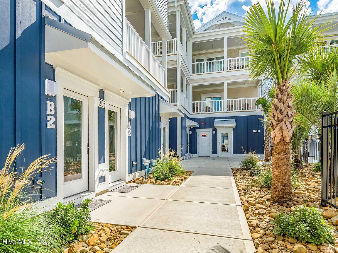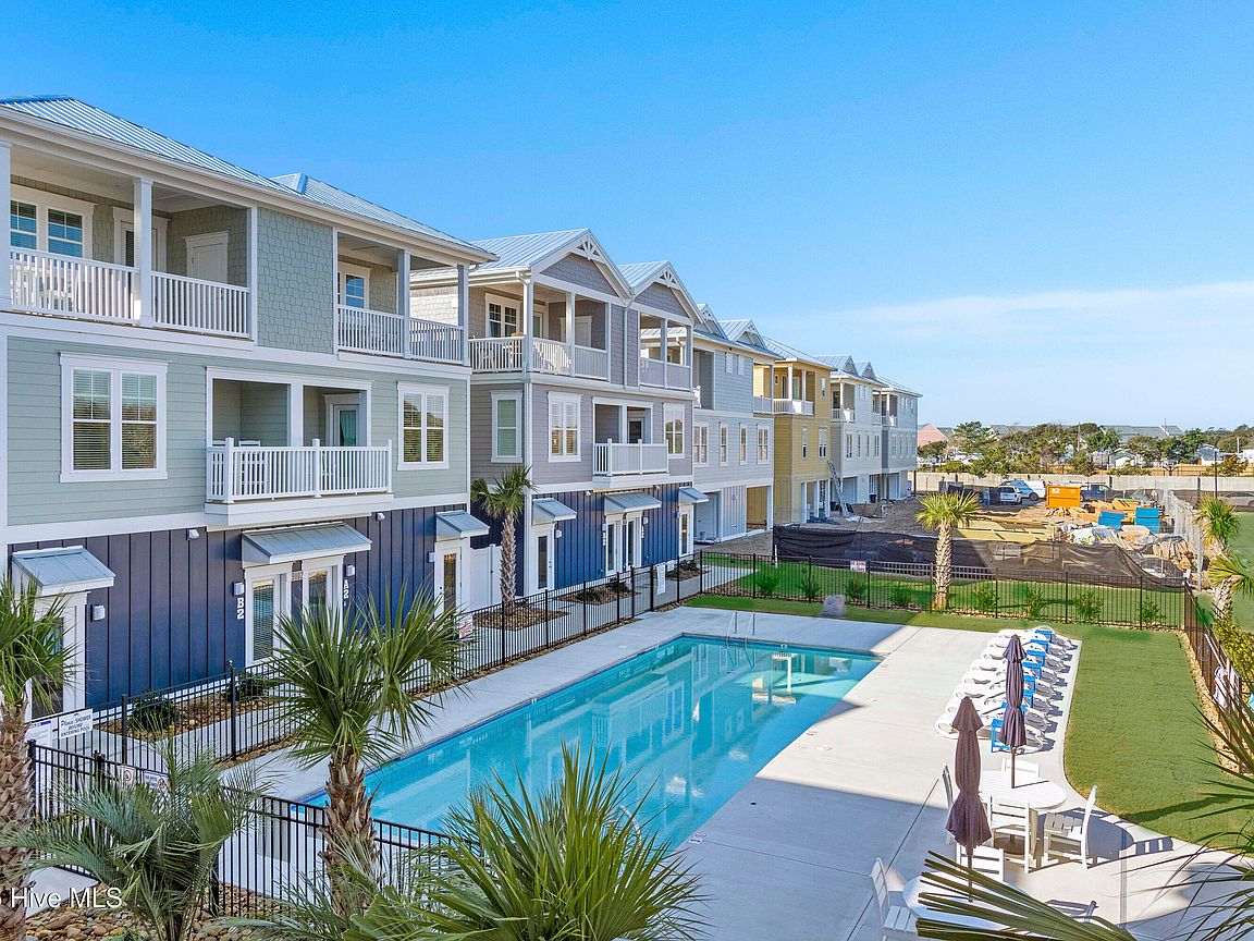 Better than new! Rarely available condo at Emerald Isle's newest mixed-use community, Village West. Unit D, one of only eleven condos, overlooks the community pool and offers peek-a-boo views of the ocean, & has three covered porches. Designed with over 1300 heated square feet, 2 bedrooms, 2.5 baths, AND a flex room. Built in 2021, this condo has all the newer build touches with 10' ceilings on the main living level, spacious kitchen with granite tops, tile backsplashes, large dining island, extra large moldings, LVP flooring, stainless appliances & more. The bedroom & flex room level feels roomy yet cozy with 9' ceiling height. The owner has expanded on the original construction with beaded board wainscotting in the stairwells. Furnished right down to the silverware (seller has a limited exclusion list). Village West offers a private outdoor community pool, bathhouse, grilling area, communal open green space, gated parking lot with 2 assigned parking spaces. Retail shopping, dining, and drinks right in your backyard. Footsteps to the boarded ocean access at Western Ocean Regional Access. Bike & pedestrian path access is only a block away. Lots of family fun awaits at the nearby Salty Pirate Water Park, the go-karts, and putt-putt. Village West businesses just footsteps away include Kostas Pizza, Beachside Emerald Isle, Velvet Anchor Anchor Bottle Shop, and Mountain Brook Vineyards. Hurry! This beauty will not last long.