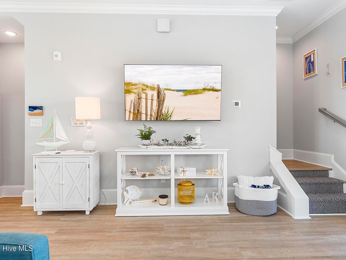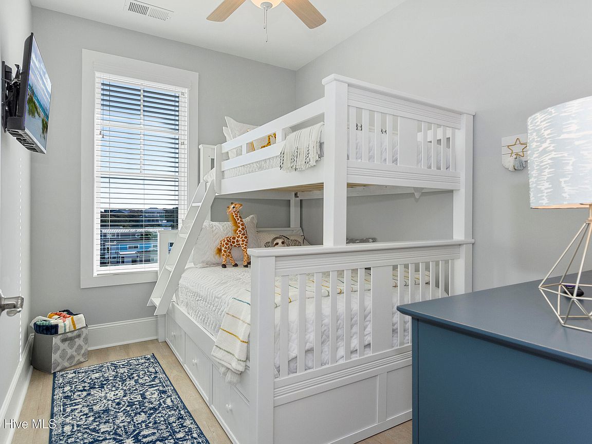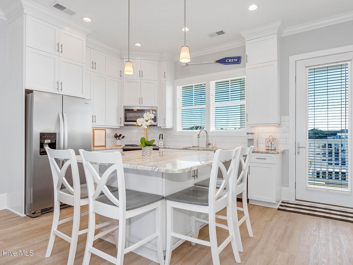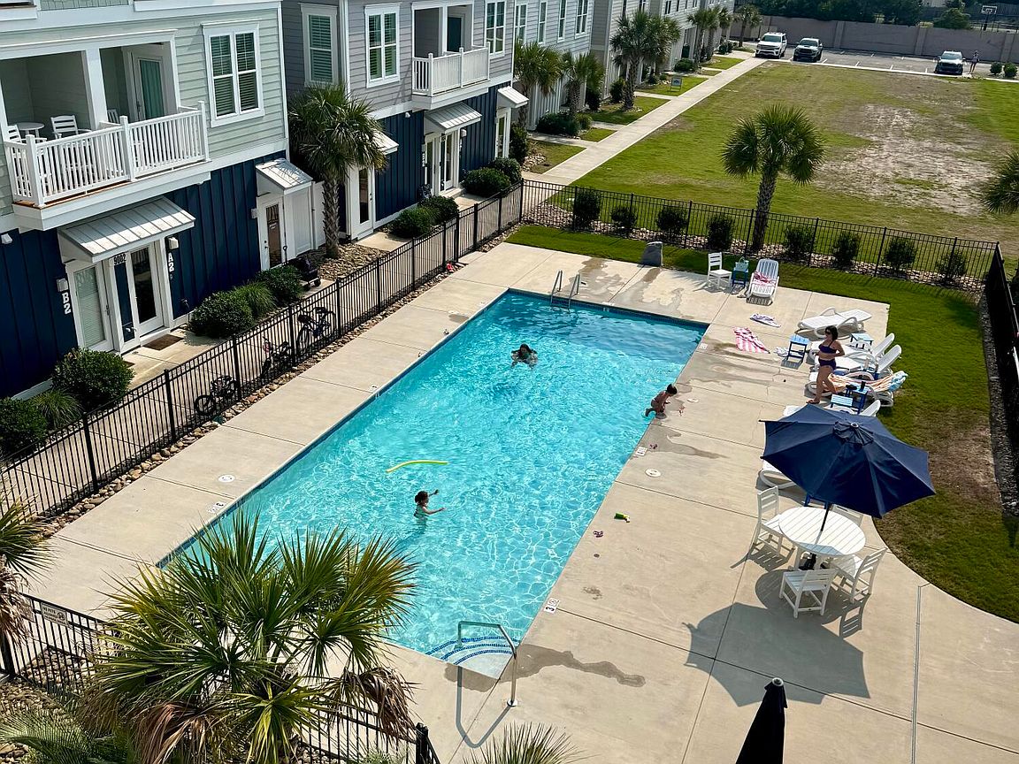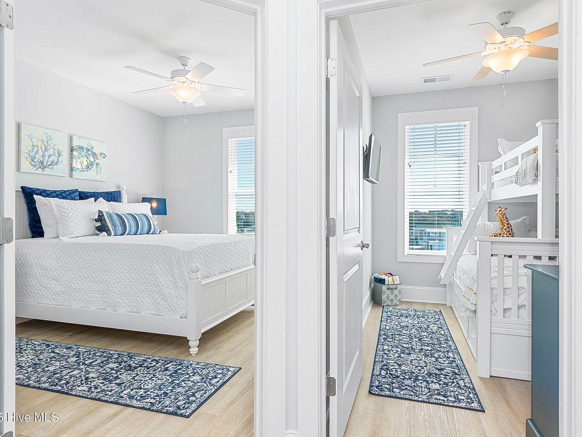 Better than new! Rarely available condo at Emerald Isle's newest mixed-use community, Village West. Unit D, one of only eleven condos, overlooks the community pool and offers peek-a-boo views of the ocean, & has three covered porches. Designed with over 1300 heated square feet, 2 bedrooms, 2.5 baths, AND a flex room. Built in 2021, this condo has all the newer build touches with 10' ceilings on the main living level, spacious kitchen with granite tops, tile backsplashes, large dining island, extra large moldings, LVP flooring, stainless appliances & more. The bedroom & flex room level feels roomy yet cozy with 9' ceiling height. The owner has expanded on the original construction with beaded board wainscotting in the stairwells. Furnished right down to the silverware (seller has a limited exclusion list). Village West offers a private outdoor community pool, bathhouse, grilling area, communal open green space, gated parking lot with 2 assigned parking spaces. Retail shopping, dining, and drinks right in your backyard. Footsteps to the boarded ocean access at Western Ocean Regional Access. Bike & pedestrian path access is only a block away. Lots of family fun awaits at the nearby Salty Pirate Water Park, the go-karts, and putt-putt. Village West businesses just footsteps away include Kostas Pizza, Beachside Emerald Isle, Velvet Anchor Anchor Bottle Shop, and Mountain Brook Vineyards. Hurry! This beauty will not last long.