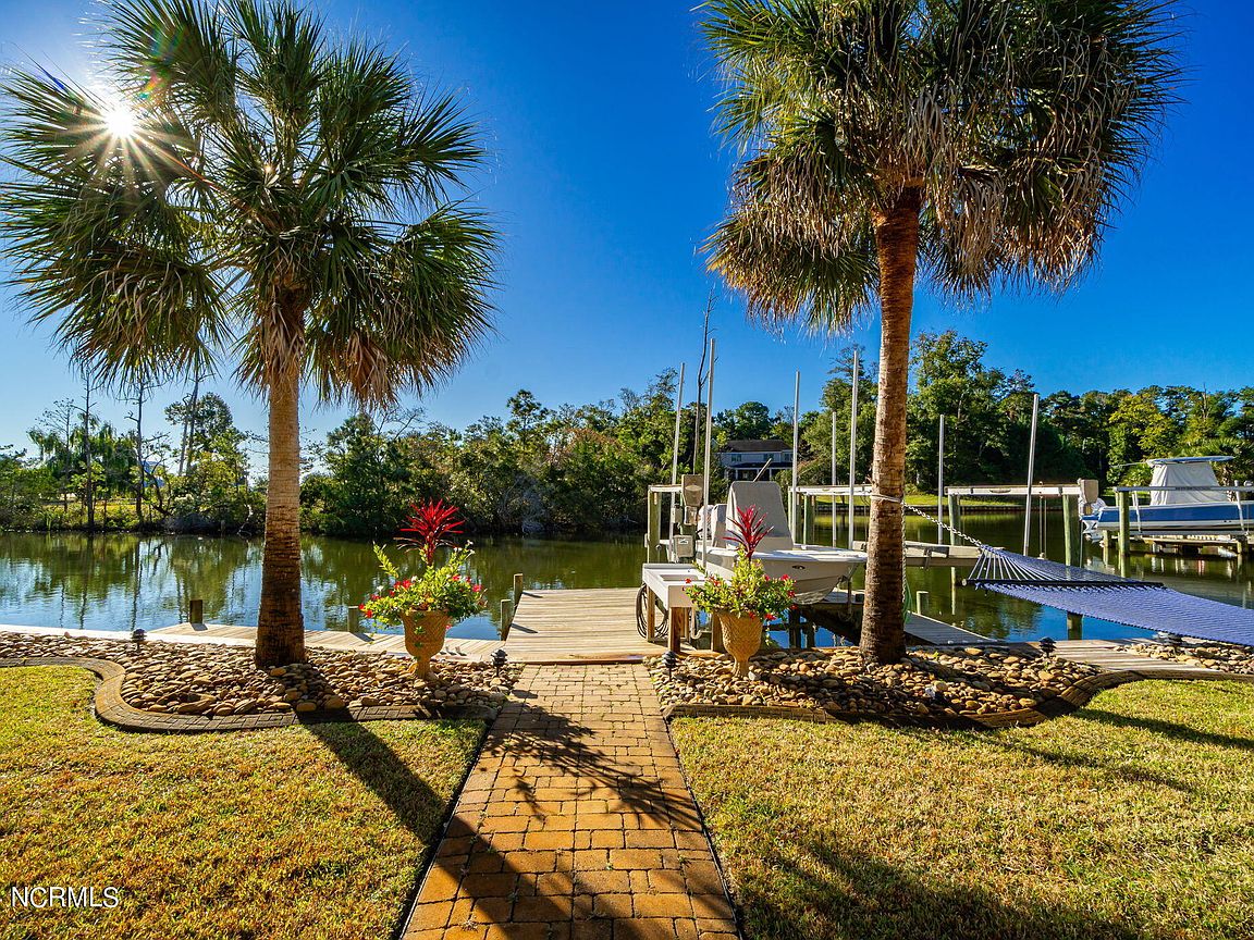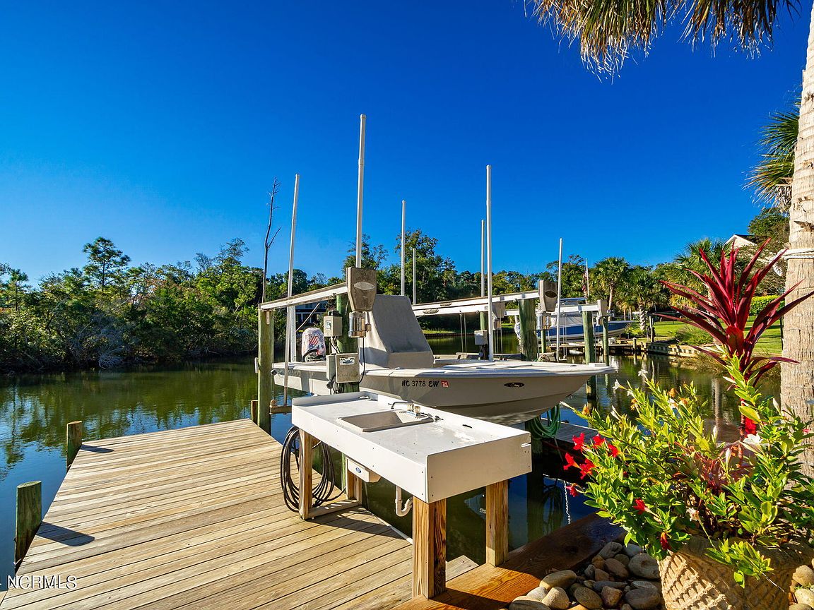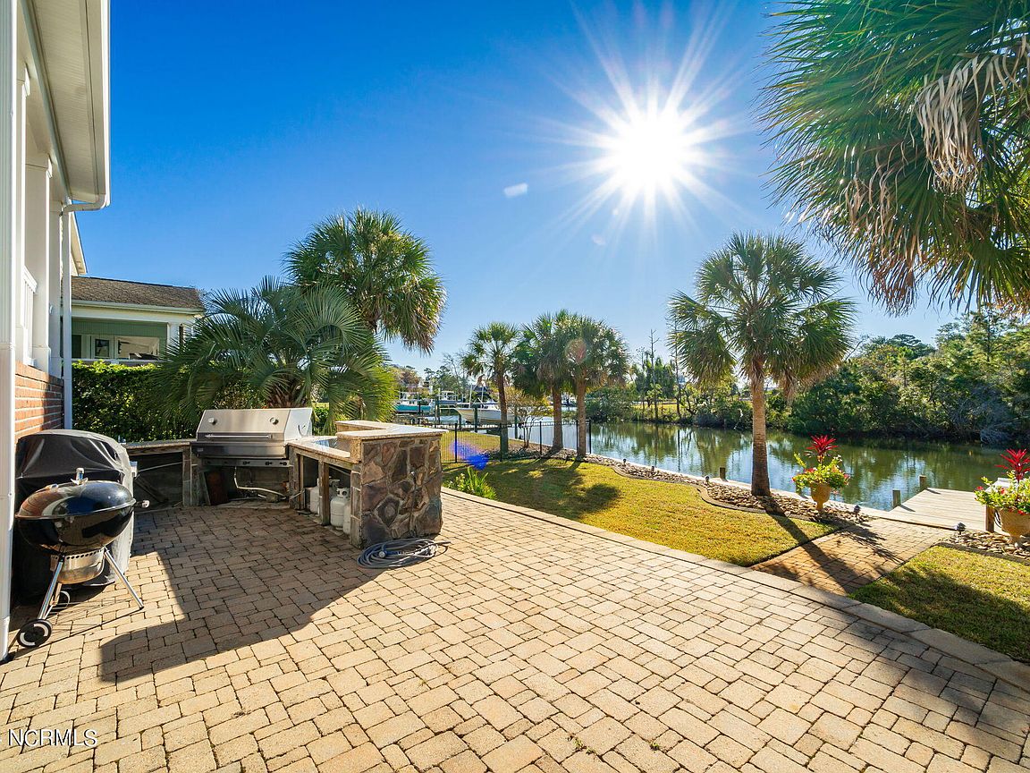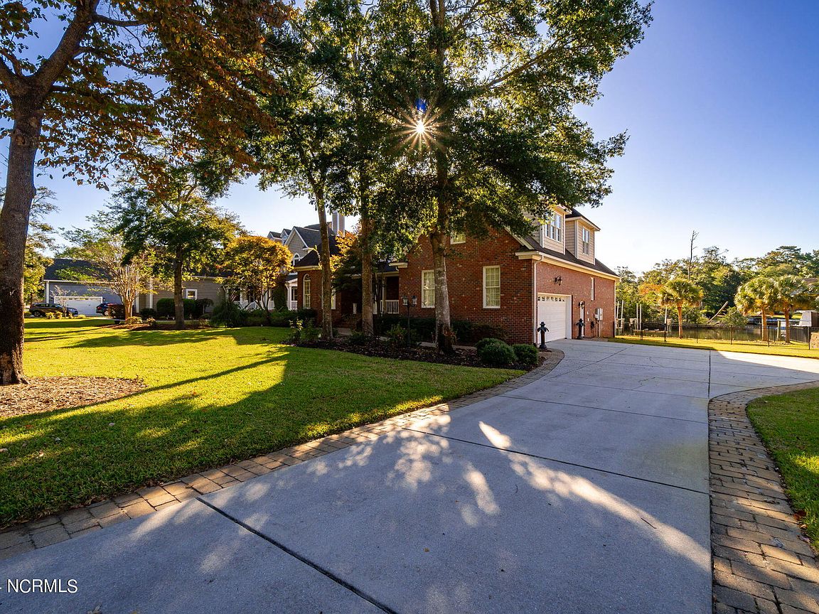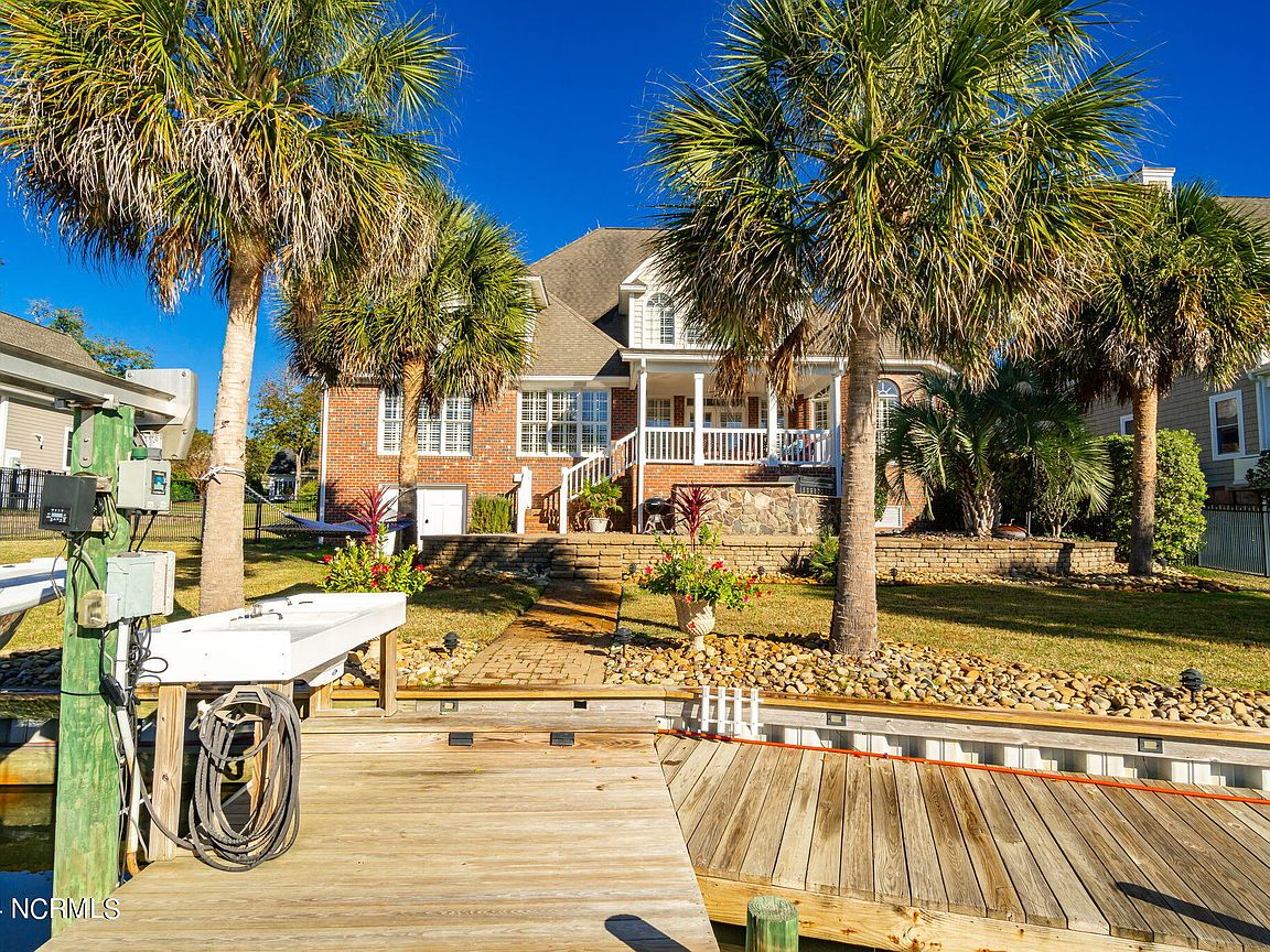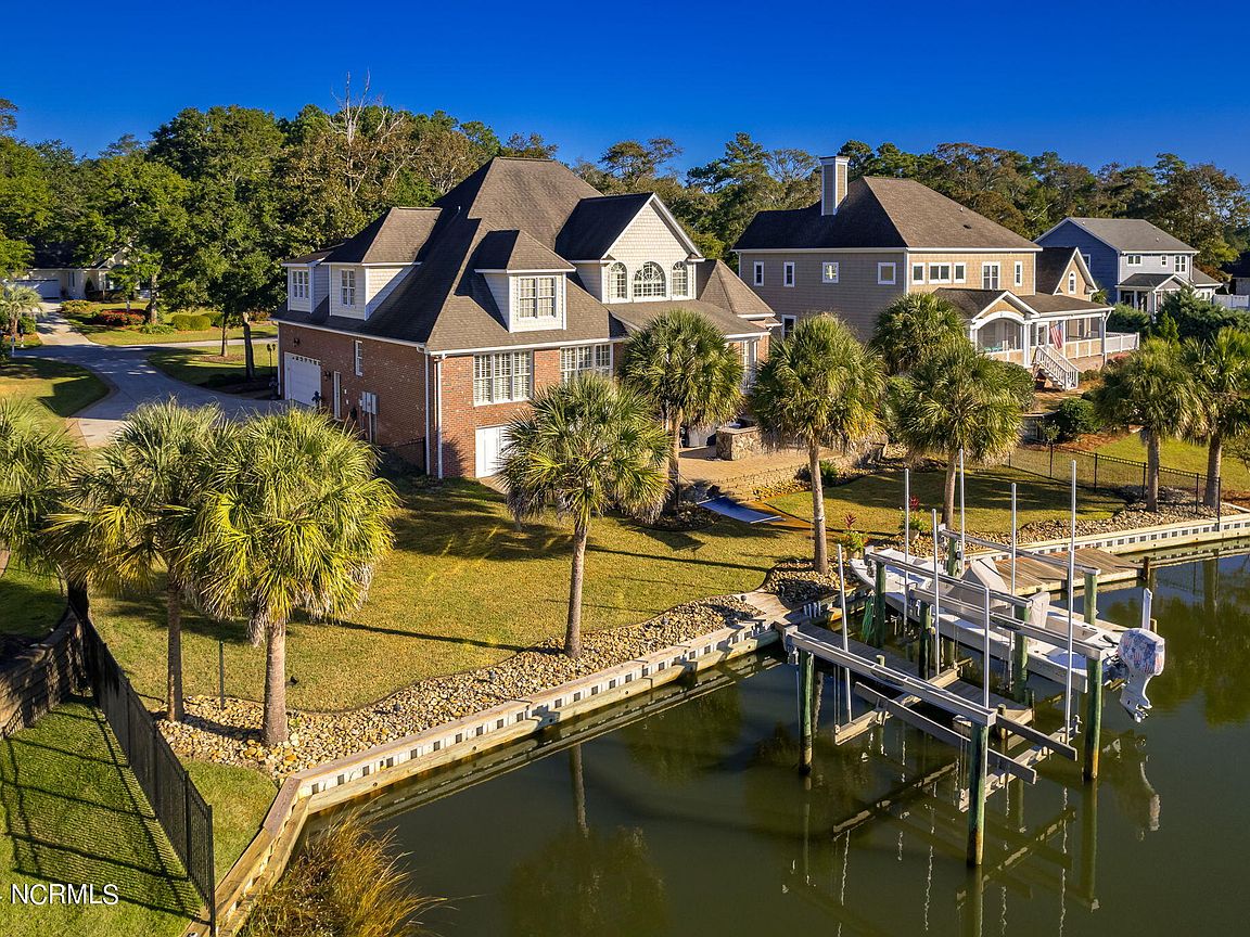 Waterfront brick home with over 4,600 SF of living space and 2 boat lifts, conveniently located in the heart of Cape Carteret. This home features 4 bedrooms, 2 bonus rooms, and 3.5 baths, showcasing custom quality throughout, including exotic hardwoods with inlays, cabinetry, and tile. The primary bedroom is on the first floor, complete with a large en-suite and a walk-in closet. It's located just off one of the two entertaining spaces on the first floor, providing easy access to the covered porch and down to the brick patio. The patio is perfect for outdoor dining, featuring a cooking area overlooking the canal. Hop on the boat for a quick ride to the Swansboro waterfront or fish the ICW. The second level includes three bedrooms, two baths, and two additional bonus rooms. There is a basement for extra storage, which can also be used as a tackle room or workshop (950 SF not included). Come experience all that 209 Bayside Drive has to offer today!