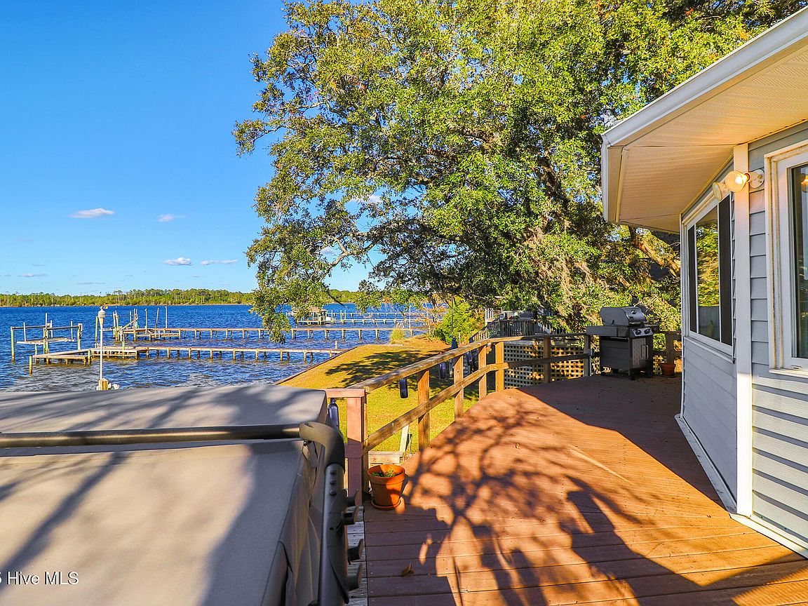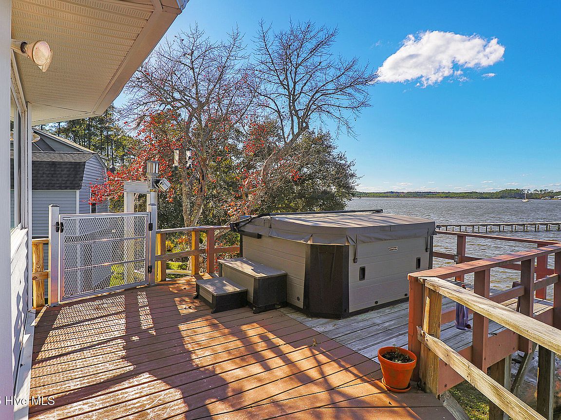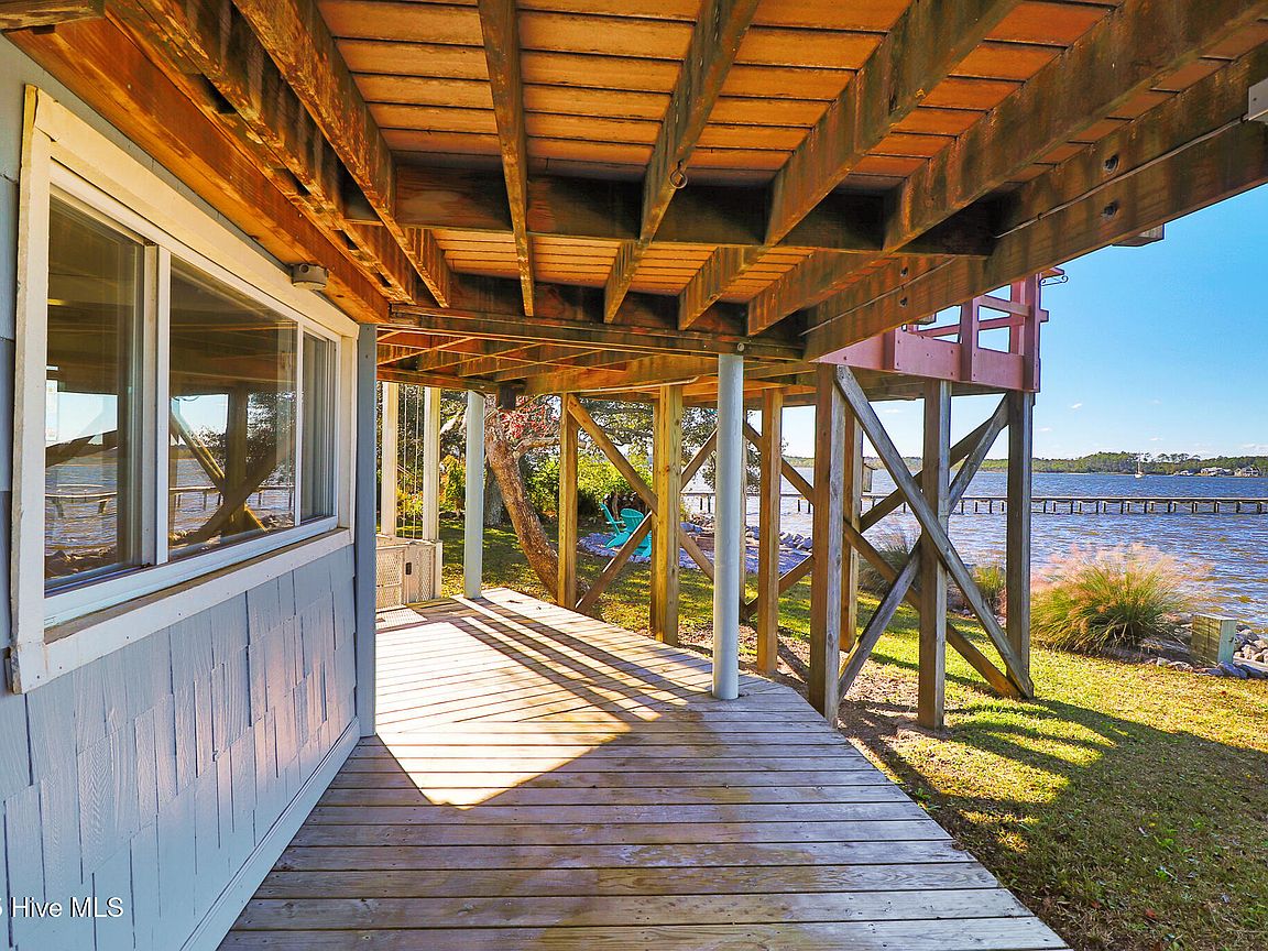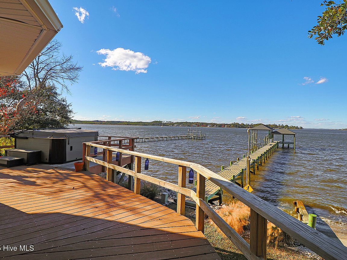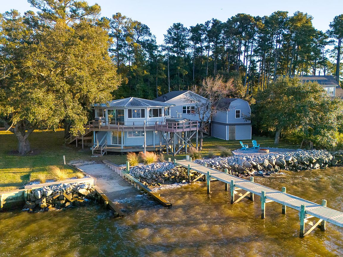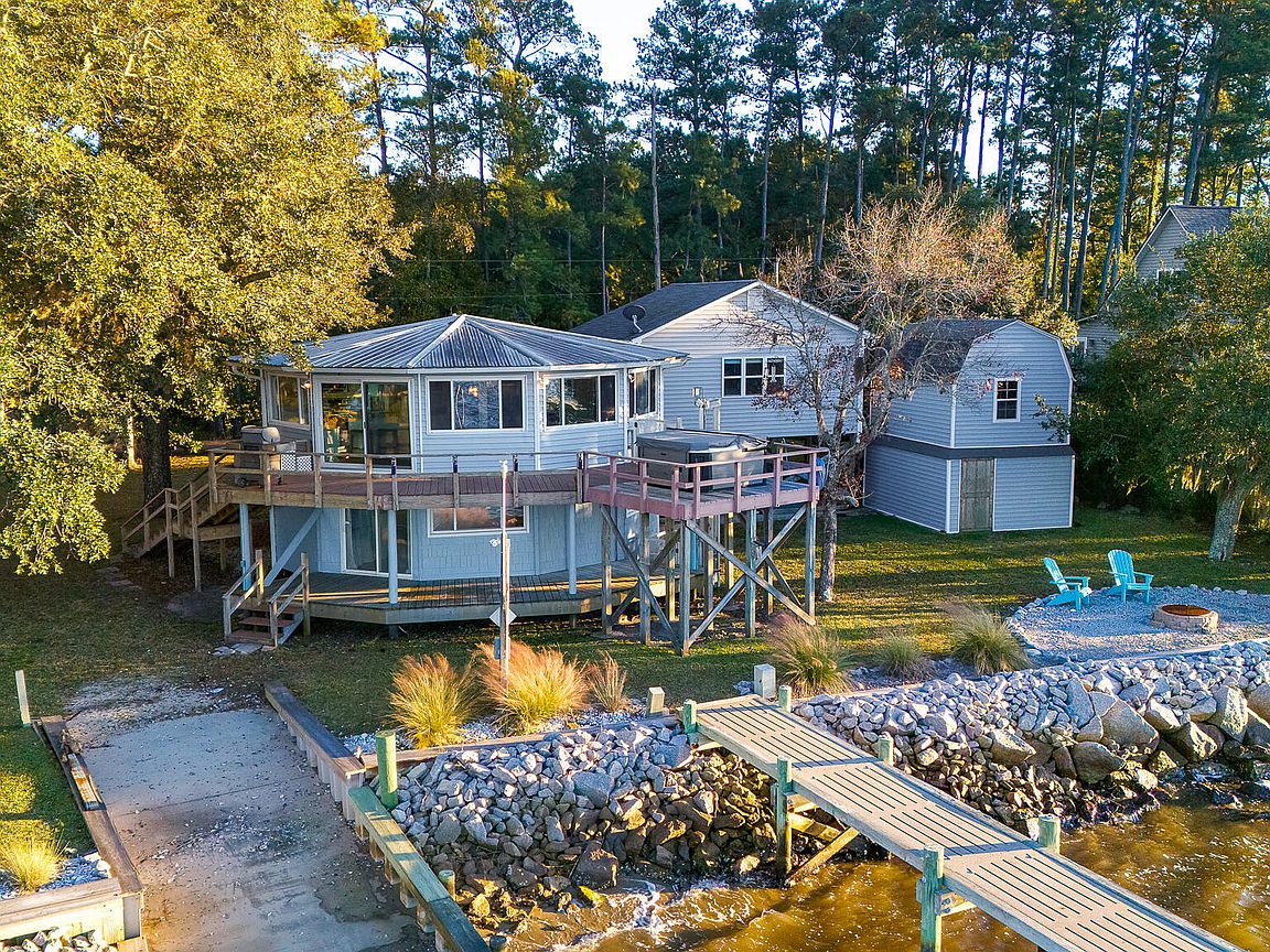Tucked along Adam's Creek, 221 Creek Rd is a one-of-a-kind waterfront retreat designed to maximize natural light and the beauty of the coast. The home's distinctive dodecagon shape, reverse floor plan, vaulted ceilings, and walls of windows capture panoramic water views from nearly every room, creating a bright, open feel that changes with the light throughout the day. The updated kitchen features quartz countertops, stainless steel appliances, a coffee bar, and a walk-in pantry—all perfectly arranged for easy entertaining and everyday living and flows to the dining and living areas. The primary suite is privately set apart in its own wing, complete with a spacious walk-in closet and ensuite bath. The lower level offers a flexible layout, opening to a flex room, ideal for guests or recreation, complete with laundry & storage closets. A jack-and-jill bath connects to a spacious, bright bedroom with sliding glass doors onto the deck and a gorgeous backyard. A storage shed with a finished loft is ideal for guests, a studio, or home office. Both the house and finished shed are heated/cooled with mini-splits. Outdoor living takes center stage with the wraparound porch, gorgeous backyard, & water access. Relax in the hot tub on the porch overlooking the sunset, seek shade in the covered deck below, or roast marshmallows over the stone firepit on the water's edge. Take advantage of the boat ramp and private dock with two boat lifts—one covered (13,000 lb) and one currently set up for two jet skis (8,000 lb). The dock also features a covered pavilion with a dock box, ceiling fan, and porch swing, ideal for soaking in the water views and watching boats cruise along the ICW. Set amongst beautiful live oak trees, this unique home feels like a secluded retreat. Truly one-of-a-kind and designed to make the most of every view and every moment on the water. Don't miss out on the opportunity to live the ideal coastal lifestyle, where life on the water is just beyond your doorste