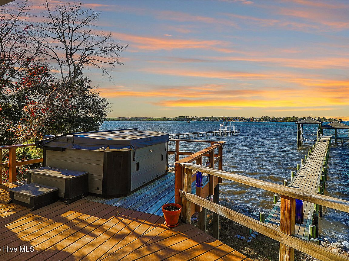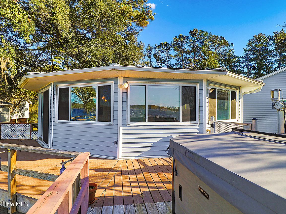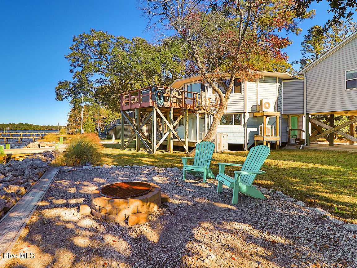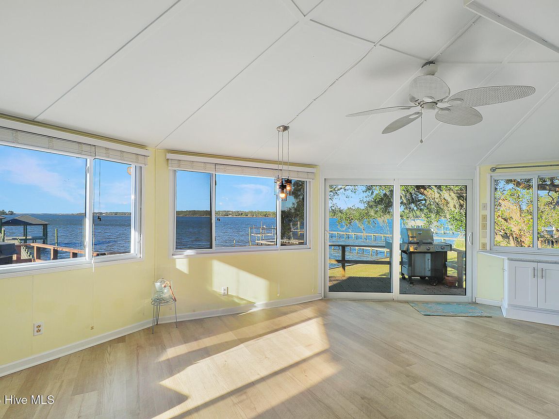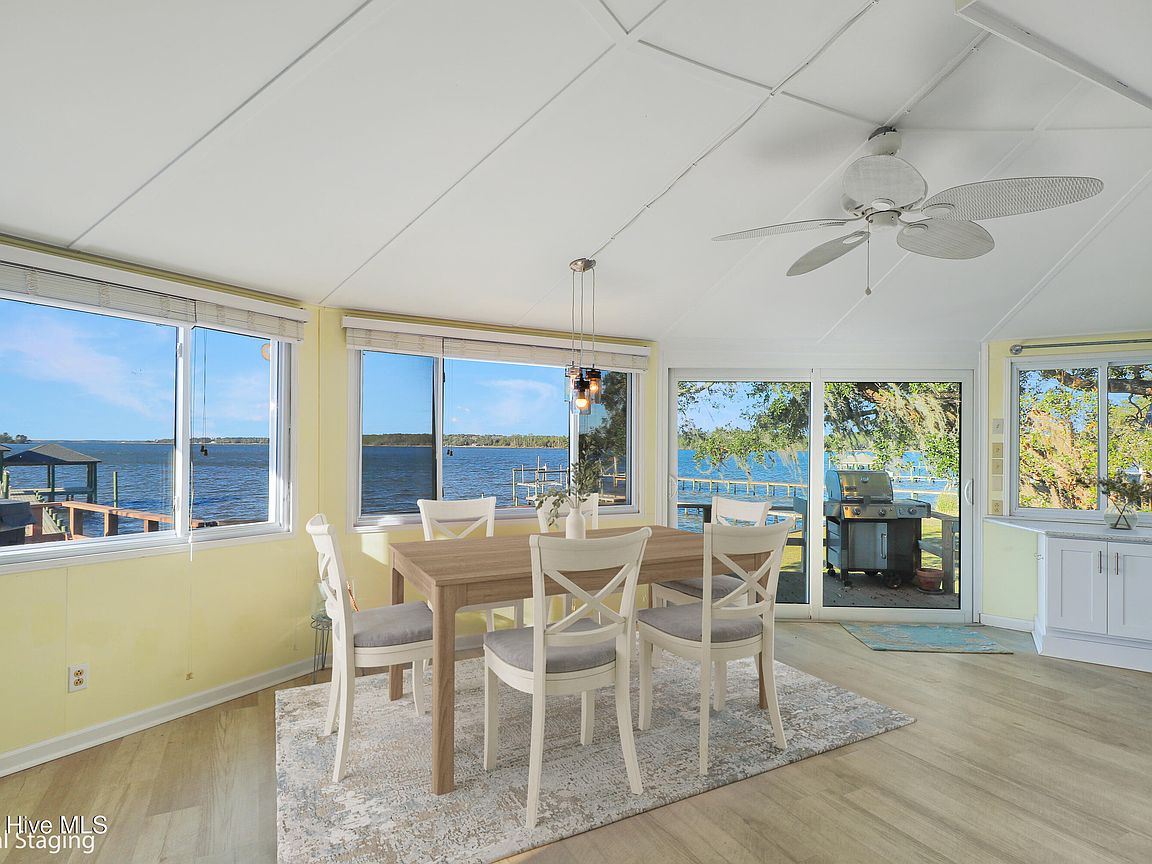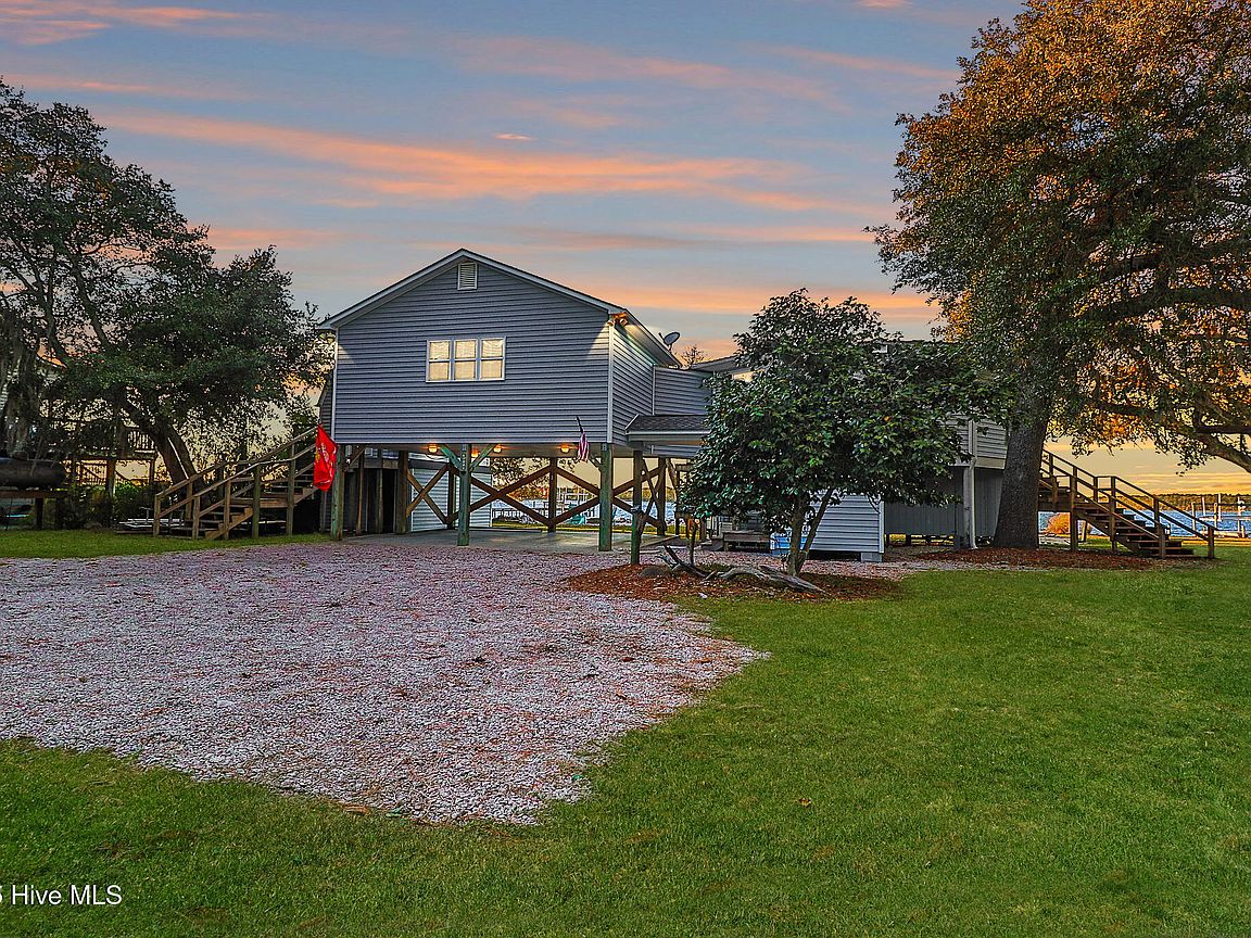 Tucked along Adam's Creek, 221 Creek Rd is a one-of-a-kind waterfront retreat designed to maximize natural light and the beauty of the coast. The home's distinctive dodecagon shape, reverse floor plan, vaulted ceilings, and walls of windows capture panoramic water views from nearly every room, creating a bright, open feel that changes with the light throughout the day. The updated kitchen features quartz countertops, stainless steel appliances, a coffee bar, and a walk-in pantry—all perfectly arranged for easy entertaining and everyday living and flows to the dining and living areas. The primary suite is privately set apart in its own wing, complete with a spacious walk-in closet and ensuite bath. The lower level offers a flexible layout, opening to a flex room, ideal for guests or recreation, complete with laundry & storage closets. A jack-and-jill bath connects to a spacious, bright bedroom with sliding glass doors onto the deck and a gorgeous backyard. A storage shed with a finished loft is ideal for guests, a studio, or home office. Both the house and finished shed are heated/cooled with mini-splits. Outdoor living takes center stage with the wraparound porch, gorgeous backyard, & water access. Relax in the hot tub on the porch overlooking the sunset, seek shade in the covered deck below, or roast marshmallows over the stone firepit on the water's edge. Take advantage of the boat ramp and private dock with two boat lifts—one covered (13,000 lb) and one currently set up for two jet skis (8,000 lb). The dock also features a covered pavilion with a dock box, ceiling fan, and porch swing, ideal for soaking in the water views and watching boats cruise along the ICW. Set amongst beautiful live oak trees, this unique home feels like a secluded retreat. Truly one-of-a-kind and designed to make the most of every view and every moment on the water. Don't miss out on the opportunity to live the ideal coastal lifestyle, where life on the water is just beyond your doorste