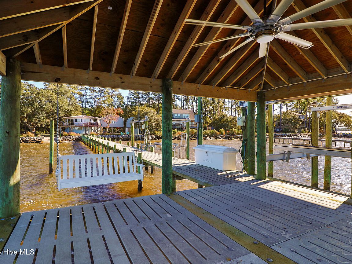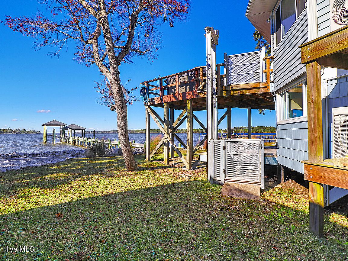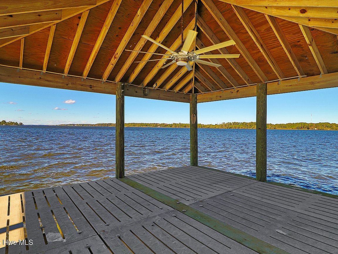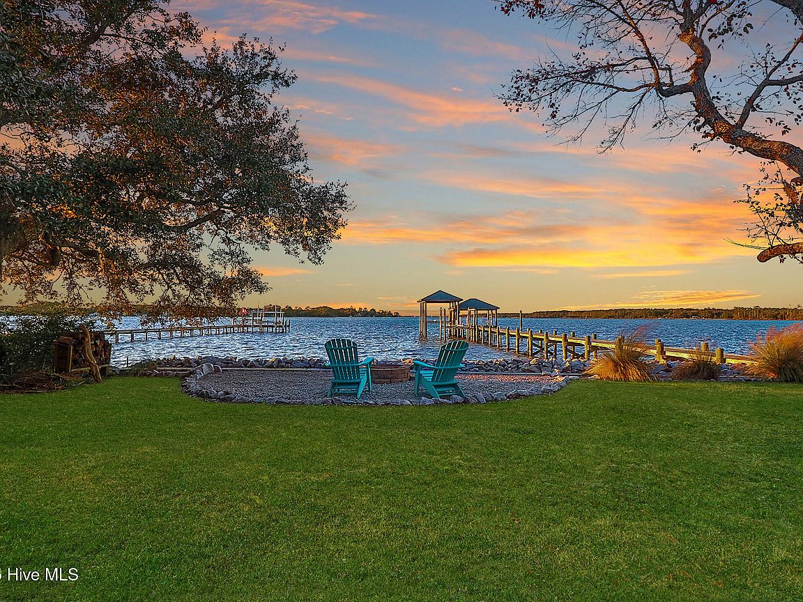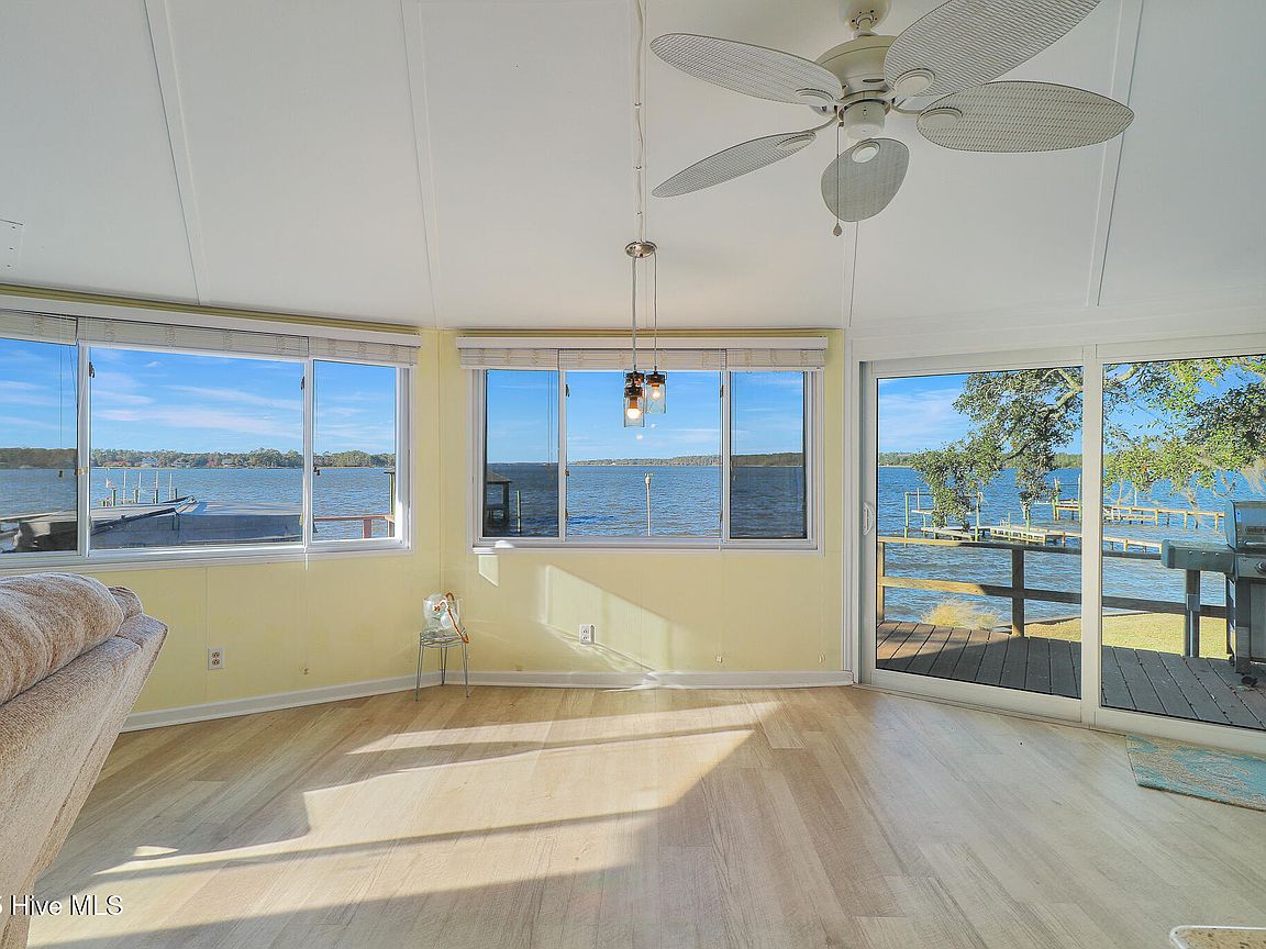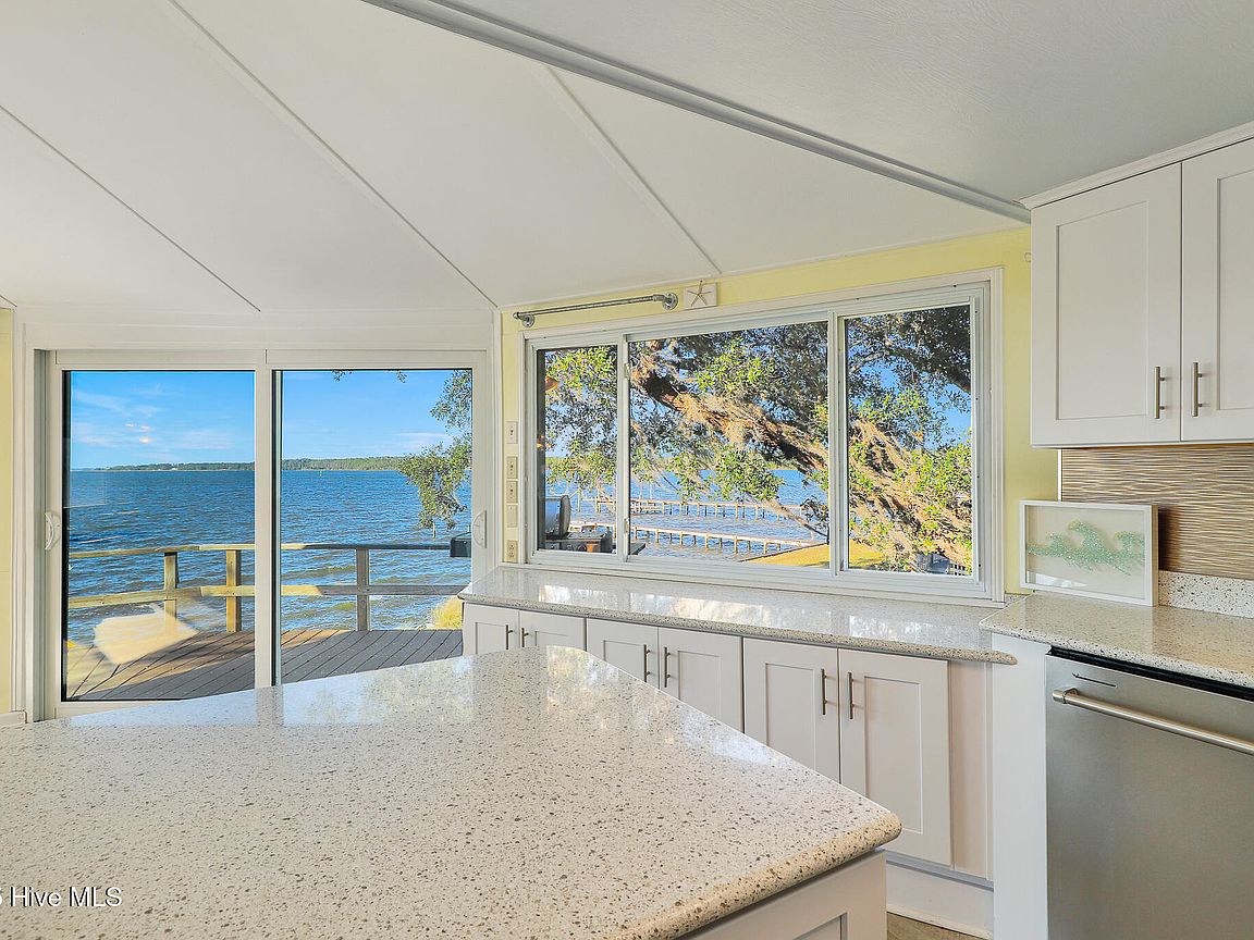 Tucked along Adam's Creek, 221 Creek Rd is a one-of-a-kind waterfront retreat designed to maximize natural light and the beauty of the coast. The home's distinctive dodecagon shape, reverse floor plan, vaulted ceilings, and walls of windows capture panoramic water views from nearly every room, creating a bright, open feel that changes with the light throughout the day. The updated kitchen features quartz countertops, stainless steel appliances, a coffee bar, and a walk-in pantry—all perfectly arranged for easy entertaining and everyday living and flows to the dining and living areas. The primary suite is privately set apart in its own wing, complete with a spacious walk-in closet and ensuite bath. The lower level offers a flexible layout, opening to a flex room, ideal for guests or recreation, complete with laundry & storage closets. A jack-and-jill bath connects to a spacious, bright bedroom with sliding glass doors onto the deck and a gorgeous backyard. A storage shed with a finished loft is ideal for guests, a studio, or home office. Both the house and finished shed are heated/cooled with mini-splits. Outdoor living takes center stage with the wraparound porch, gorgeous backyard, & water access. Relax in the hot tub on the porch overlooking the sunset, seek shade in the covered deck below, or roast marshmallows over the stone firepit on the water's edge. Take advantage of the boat ramp and private dock with two boat lifts—one covered (13,000 lb) and one currently set up for two jet skis (8,000 lb). The dock also features a covered pavilion with a dock box, ceiling fan, and porch swing, ideal for soaking in the water views and watching boats cruise along the ICW. Set amongst beautiful live oak trees, this unique home feels like a secluded retreat. Truly one-of-a-kind and designed to make the most of every view and every moment on the water. Don't miss out on the opportunity to live the ideal coastal lifestyle, where life on the water is just beyond your doorste