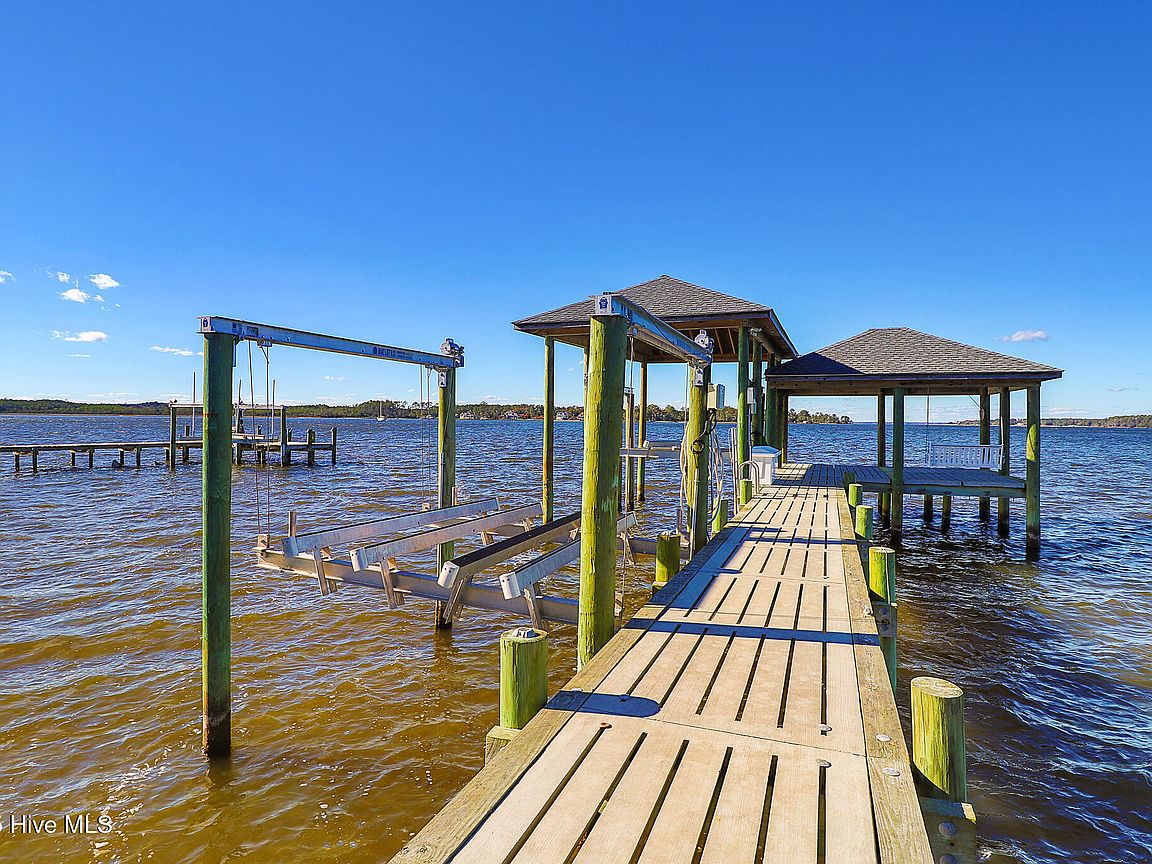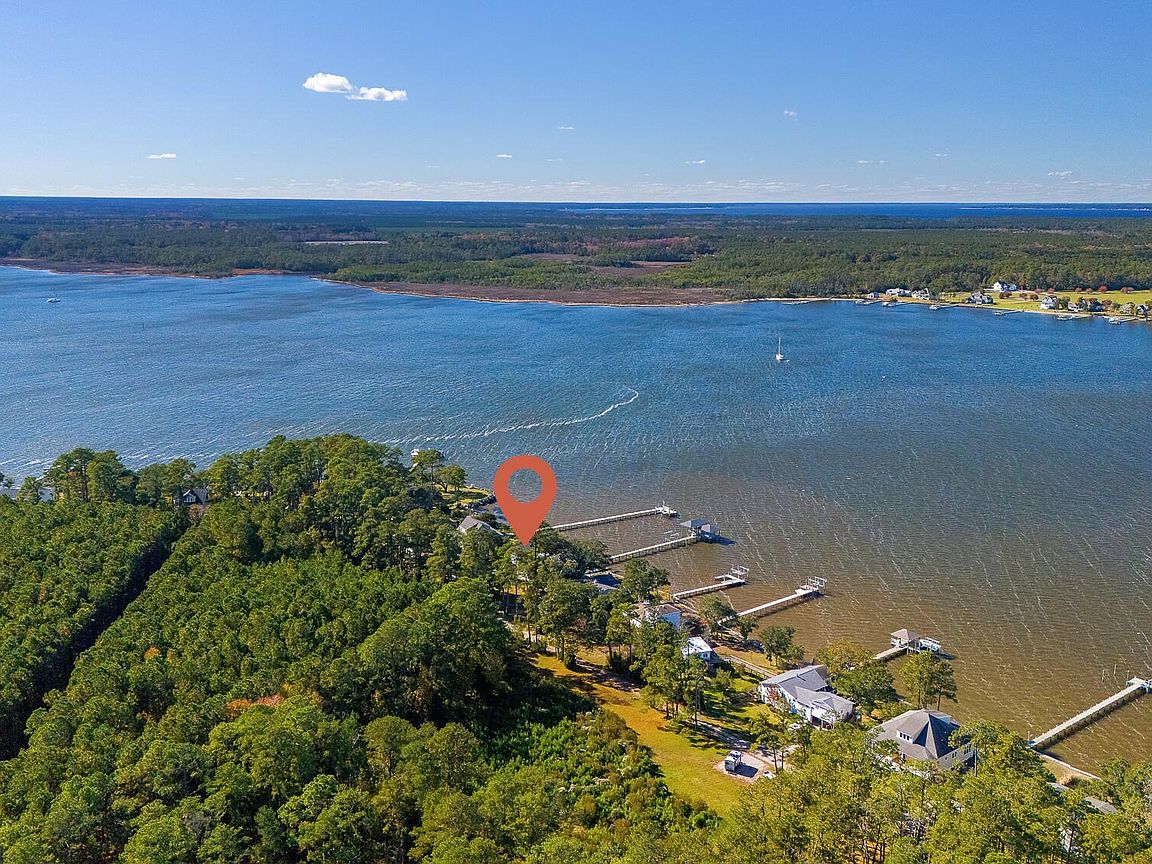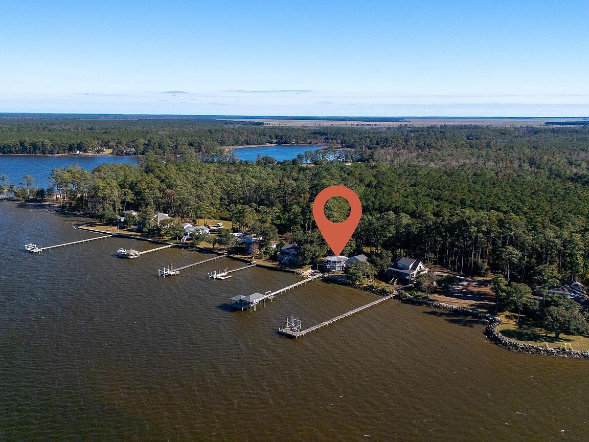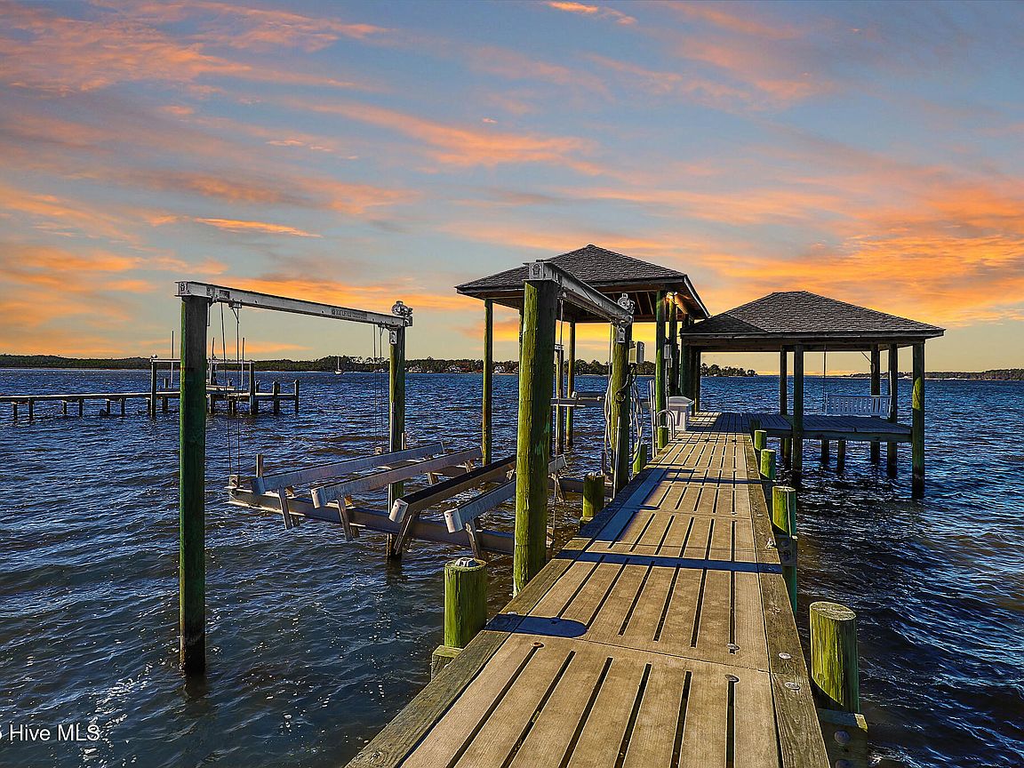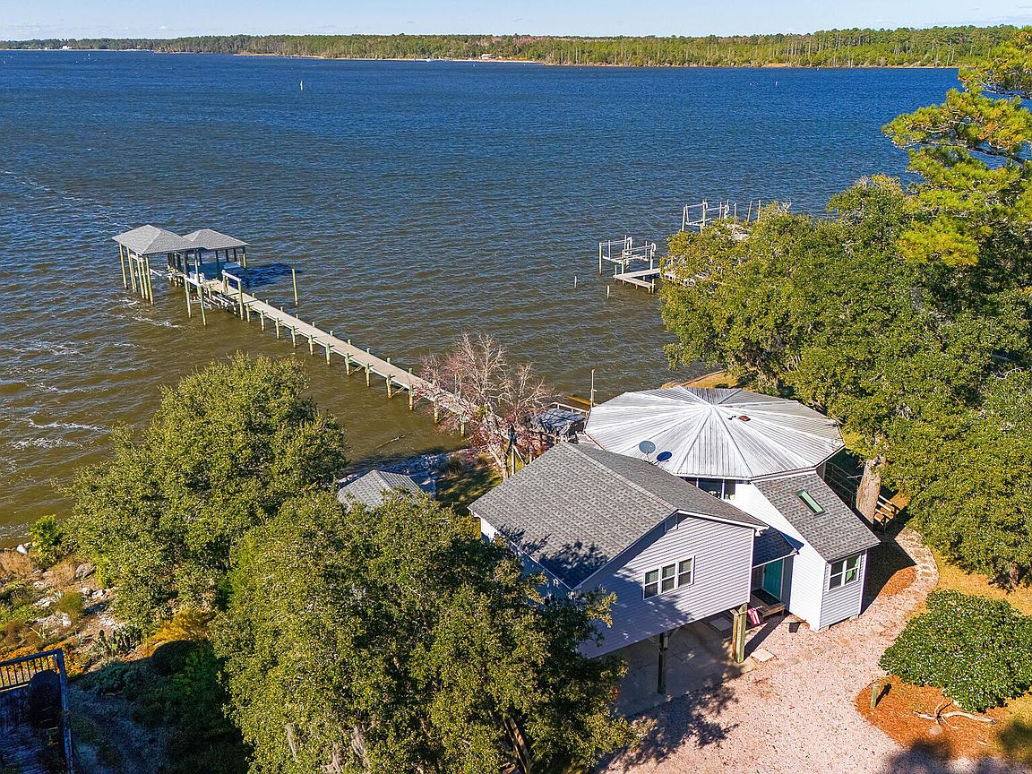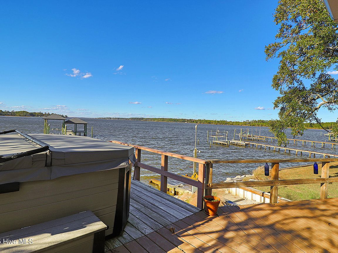 Tucked along Adam's Creek, 221 Creek Rd is a one-of-a-kind waterfront retreat designed to maximize natural light and the beauty of the coast. The home's distinctive dodecagon shape, reverse floor plan, vaulted ceilings, and walls of windows capture panoramic water views from nearly every room, creating a bright, open feel that changes with the light throughout the day. The updated kitchen features quartz countertops, stainless steel appliances, a coffee bar, and a walk-in pantry—all perfectly arranged for easy entertaining and everyday living and flows to the dining and living areas. The primary suite is privately set apart in its own wing, complete with a spacious walk-in closet and ensuite bath. The lower level offers a flexible layout, opening to a flex room, ideal for guests or recreation, complete with laundry & storage closets. A jack-and-jill bath connects to a spacious, bright bedroom with sliding glass doors onto the deck and a gorgeous backyard. A storage shed with a finished loft is ideal for guests, a studio, or home office. Both the house and finished shed are heated/cooled with mini-splits. Outdoor living takes center stage with the wraparound porch, gorgeous backyard, & water access. Relax in the hot tub on the porch overlooking the sunset, seek shade in the covered deck below, or roast marshmallows over the stone firepit on the water's edge. Take advantage of the boat ramp and private dock with two boat lifts—one covered (13,000 lb) and one currently set up for two jet skis (8,000 lb). The dock also features a covered pavilion with a dock box, ceiling fan, and porch swing, ideal for soaking in the water views and watching boats cruise along the ICW. Set amongst beautiful live oak trees, this unique home feels like a secluded retreat. Truly one-of-a-kind and designed to make the most of every view and every moment on the water. Don't miss out on the opportunity to live the ideal coastal lifestyle, where life on the water is just beyond your doorste