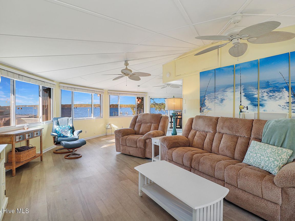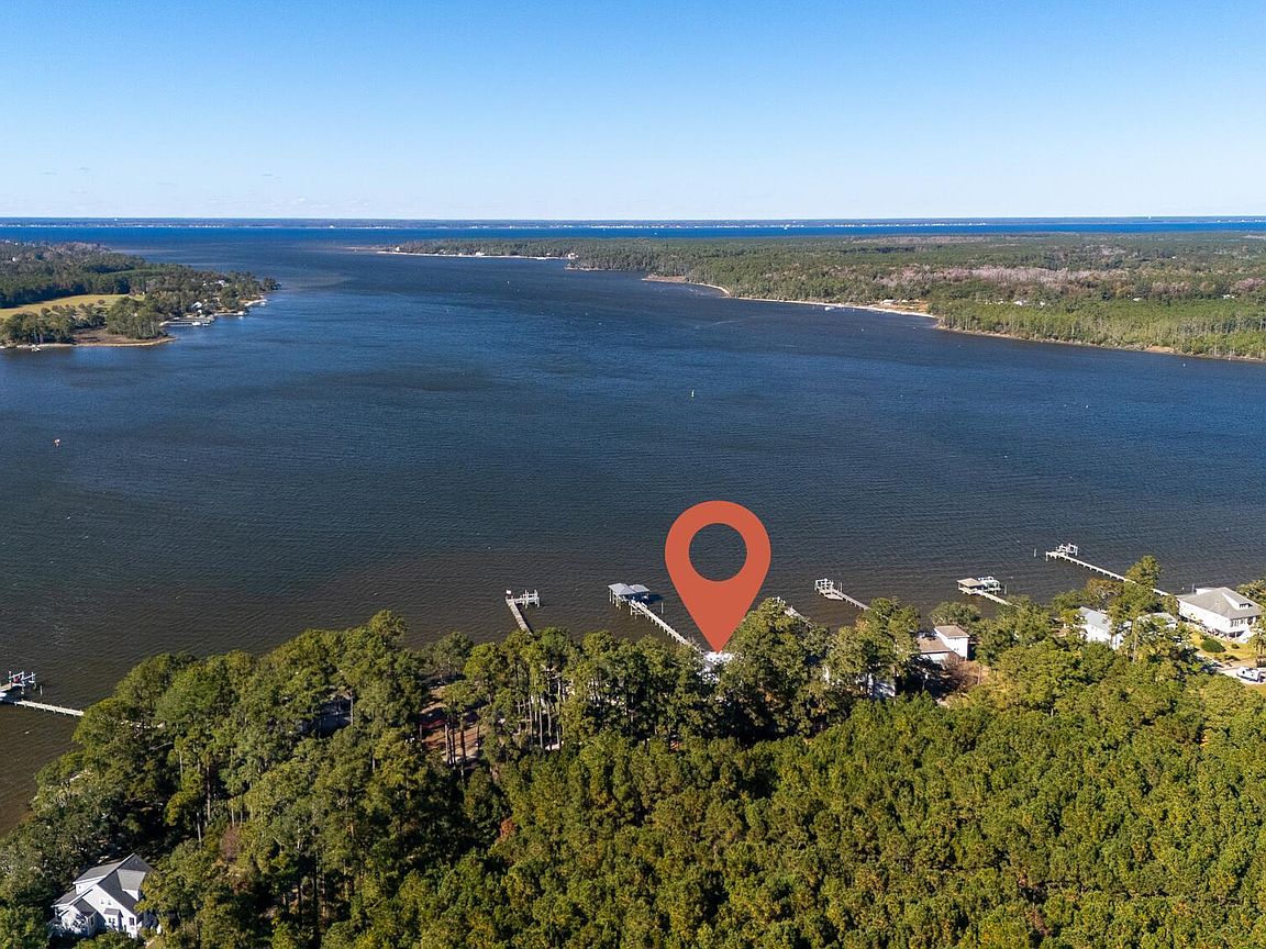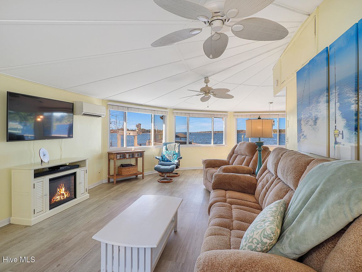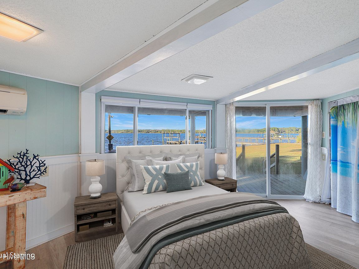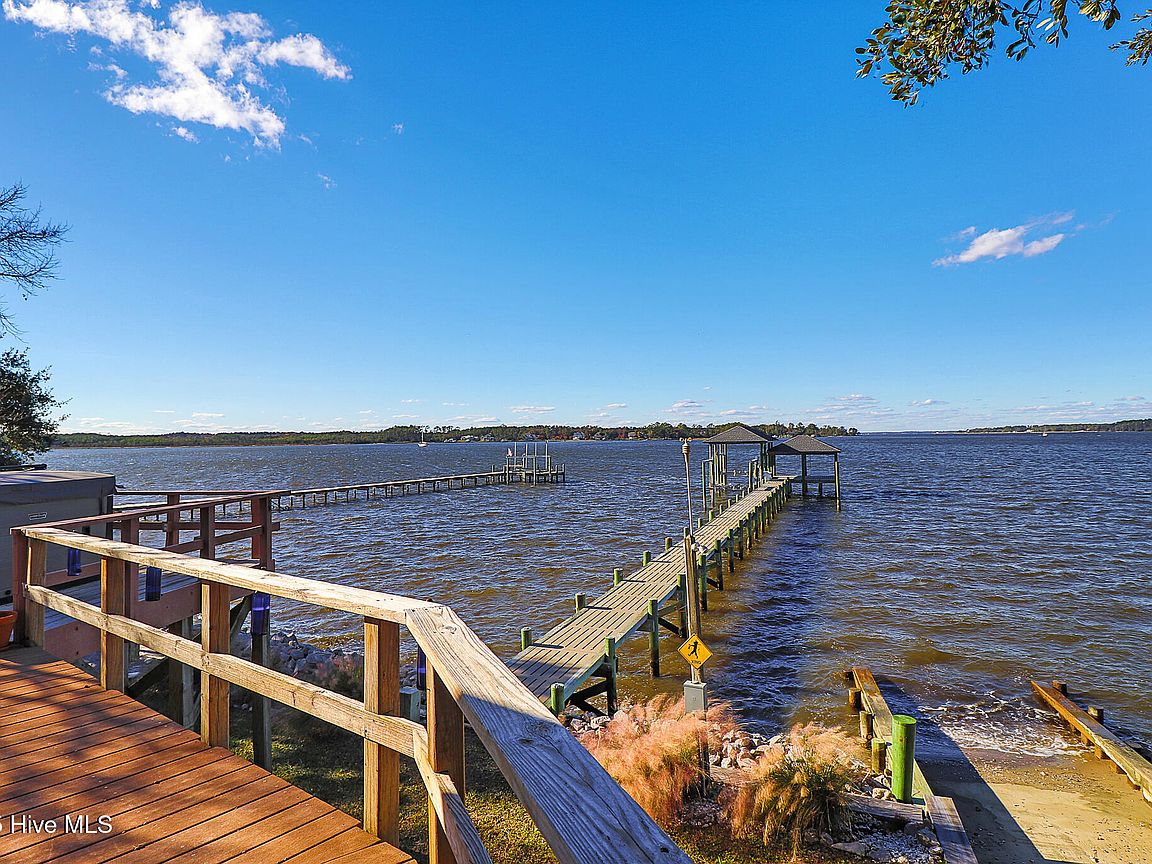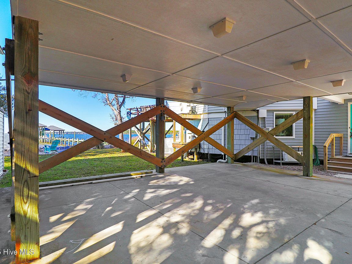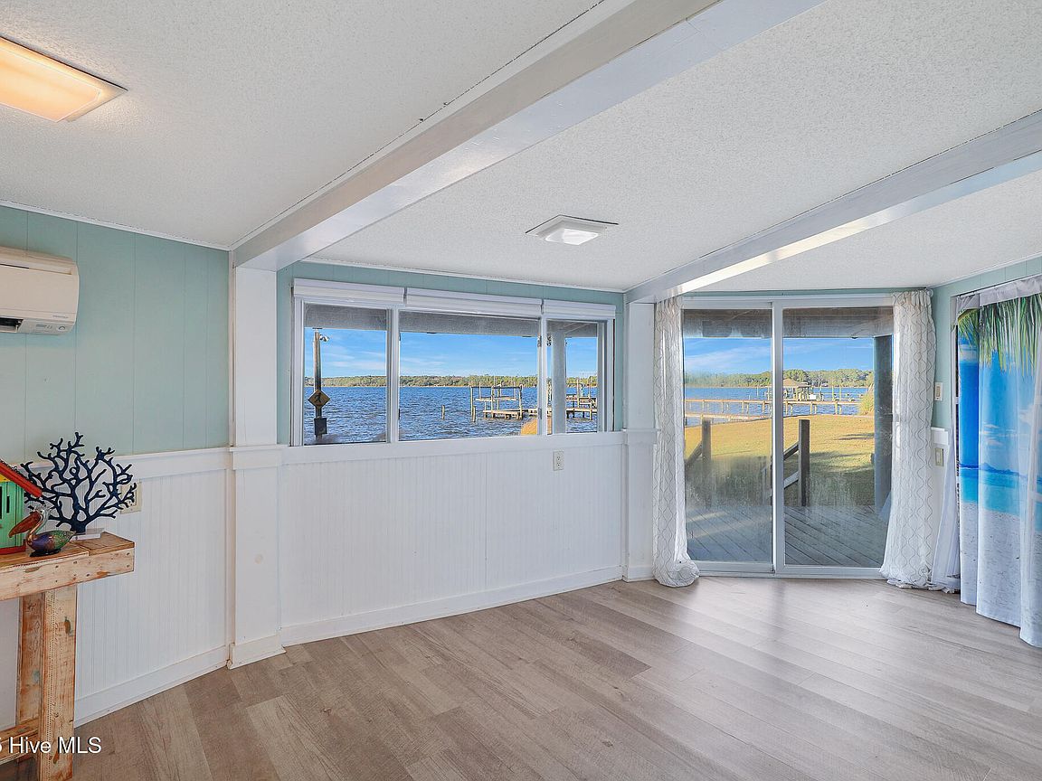 Tucked along Adam's Creek, 221 Creek Rd is a one-of-a-kind waterfront retreat designed to maximize natural light and the beauty of the coast. The home's distinctive dodecagon shape, reverse floor plan, vaulted ceilings, and walls of windows capture panoramic water views from nearly every room, creating a bright, open feel that changes with the light throughout the day. The updated kitchen features quartz countertops, stainless steel appliances, a coffee bar, and a walk-in pantry—all perfectly arranged for easy entertaining and everyday living and flows to the dining and living areas. The primary suite is privately set apart in its own wing, complete with a spacious walk-in closet and ensuite bath. The lower level offers a flexible layout, opening to a flex room, ideal for guests or recreation, complete with laundry & storage closets. A jack-and-jill bath connects to a spacious, bright bedroom with sliding glass doors onto the deck and a gorgeous backyard. A storage shed with a finished loft is ideal for guests, a studio, or home office. Both the house and finished shed are heated/cooled with mini-splits. Outdoor living takes center stage with the wraparound porch, gorgeous backyard, & water access. Relax in the hot tub on the porch overlooking the sunset, seek shade in the covered deck below, or roast marshmallows over the stone firepit on the water's edge. Take advantage of the boat ramp and private dock with two boat lifts—one covered (13,000 lb) and one currently set up for two jet skis (8,000 lb). The dock also features a covered pavilion with a dock box, ceiling fan, and porch swing, ideal for soaking in the water views and watching boats cruise along the ICW. Set amongst beautiful live oak trees, this unique home feels like a secluded retreat. Truly one-of-a-kind and designed to make the most of every view and every moment on the water. Don't miss out on the opportunity to live the ideal coastal lifestyle, where life on the water is just beyond your doorste