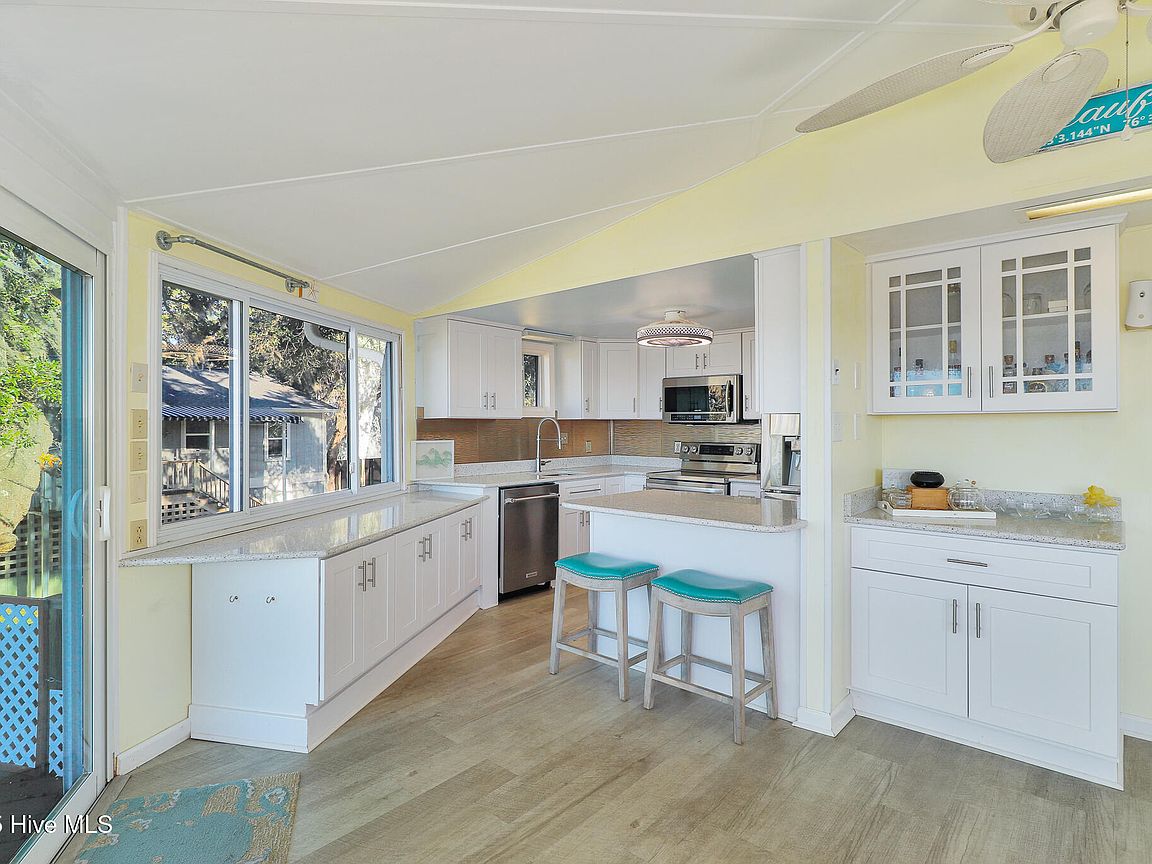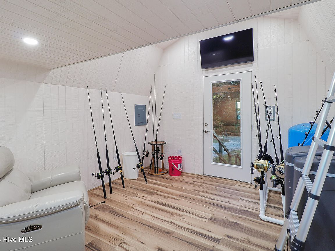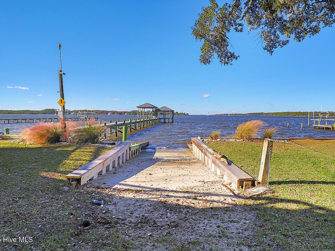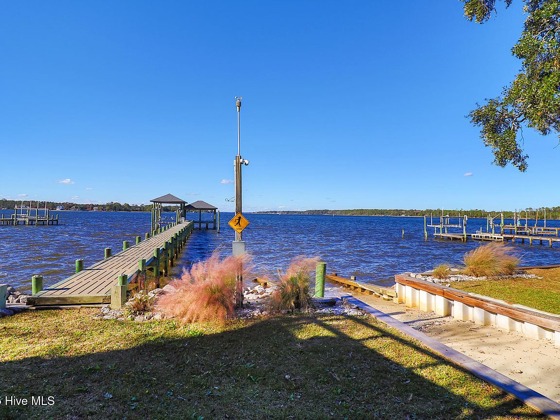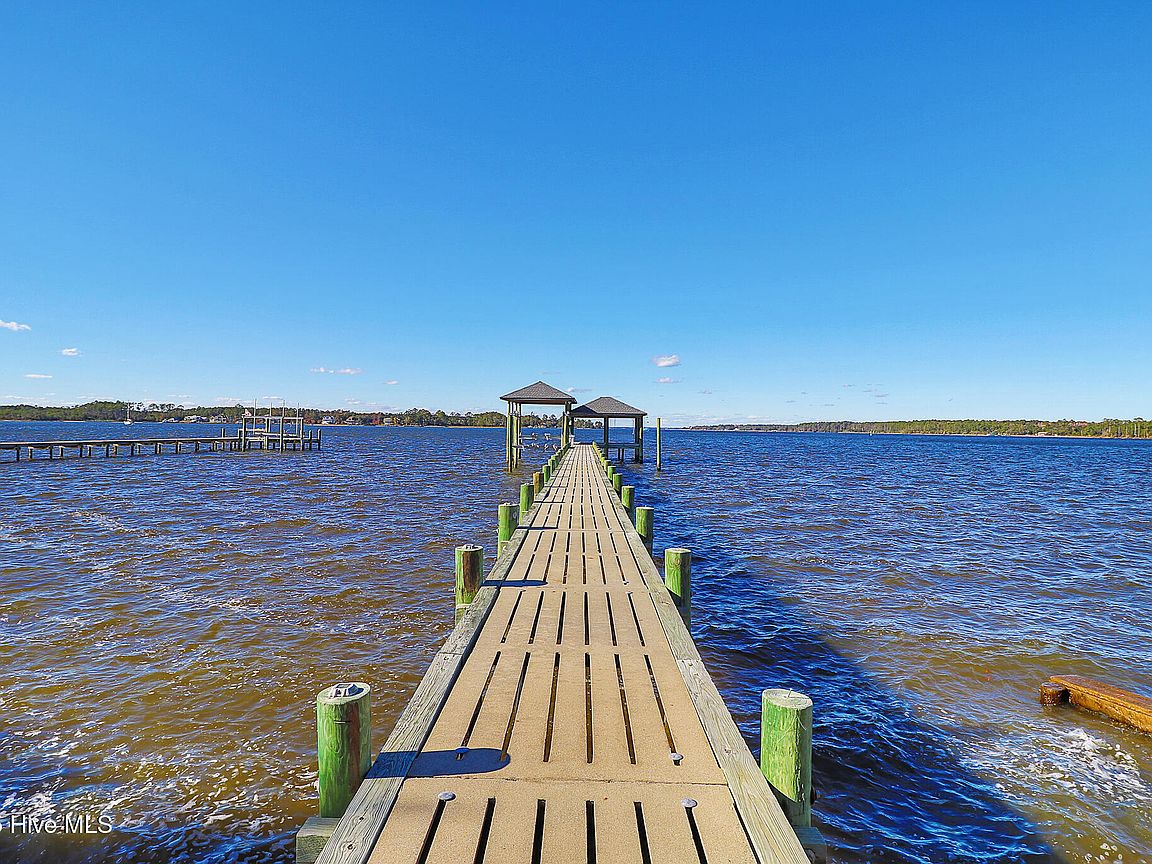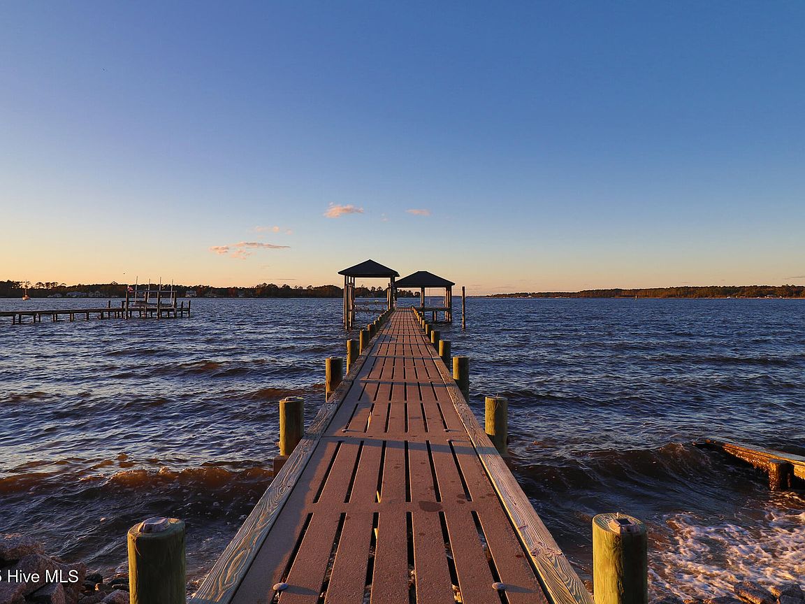 Tucked along Adam's Creek, 221 Creek Rd is a one-of-a-kind waterfront retreat designed to maximize natural light and the beauty of the coast. The home's distinctive dodecagon shape, reverse floor plan, vaulted ceilings, and walls of windows capture panoramic water views from nearly every room, creating a bright, open feel that changes with the light throughout the day. The updated kitchen features quartz countertops, stainless steel appliances, a coffee bar, and a walk-in pantry—all perfectly arranged for easy entertaining and everyday living and flows to the dining and living areas. The primary suite is privately set apart in its own wing, complete with a spacious walk-in closet and ensuite bath. The lower level offers a flexible layout, opening to a flex room, ideal for guests or recreation, complete with laundry & storage closets. A jack-and-jill bath connects to a spacious, bright bedroom with sliding glass doors onto the deck and a gorgeous backyard. A storage shed with a finished loft is ideal for guests, a studio, or home office. Both the house and finished shed are heated/cooled with mini-splits. Outdoor living takes center stage with the wraparound porch, gorgeous backyard, & water access. Relax in the hot tub on the porch overlooking the sunset, seek shade in the covered deck below, or roast marshmallows over the stone firepit on the water's edge. Take advantage of the boat ramp and private dock with two boat lifts—one covered (13,000 lb) and one currently set up for two jet skis (8,000 lb). The dock also features a covered pavilion with a dock box, ceiling fan, and porch swing, ideal for soaking in the water views and watching boats cruise along the ICW. Set amongst beautiful live oak trees, this unique home feels like a secluded retreat. Truly one-of-a-kind and designed to make the most of every view and every moment on the water. Don't miss out on the opportunity to live the ideal coastal lifestyle, where life on the water is just beyond your doorste