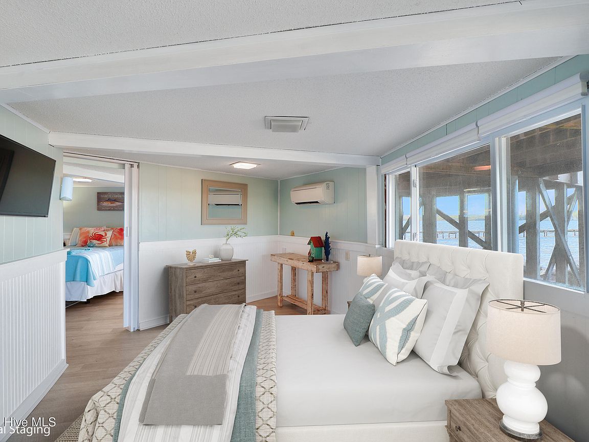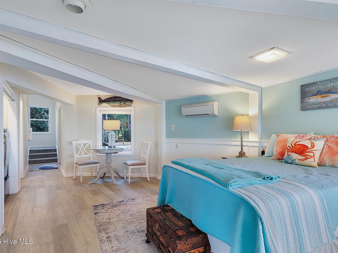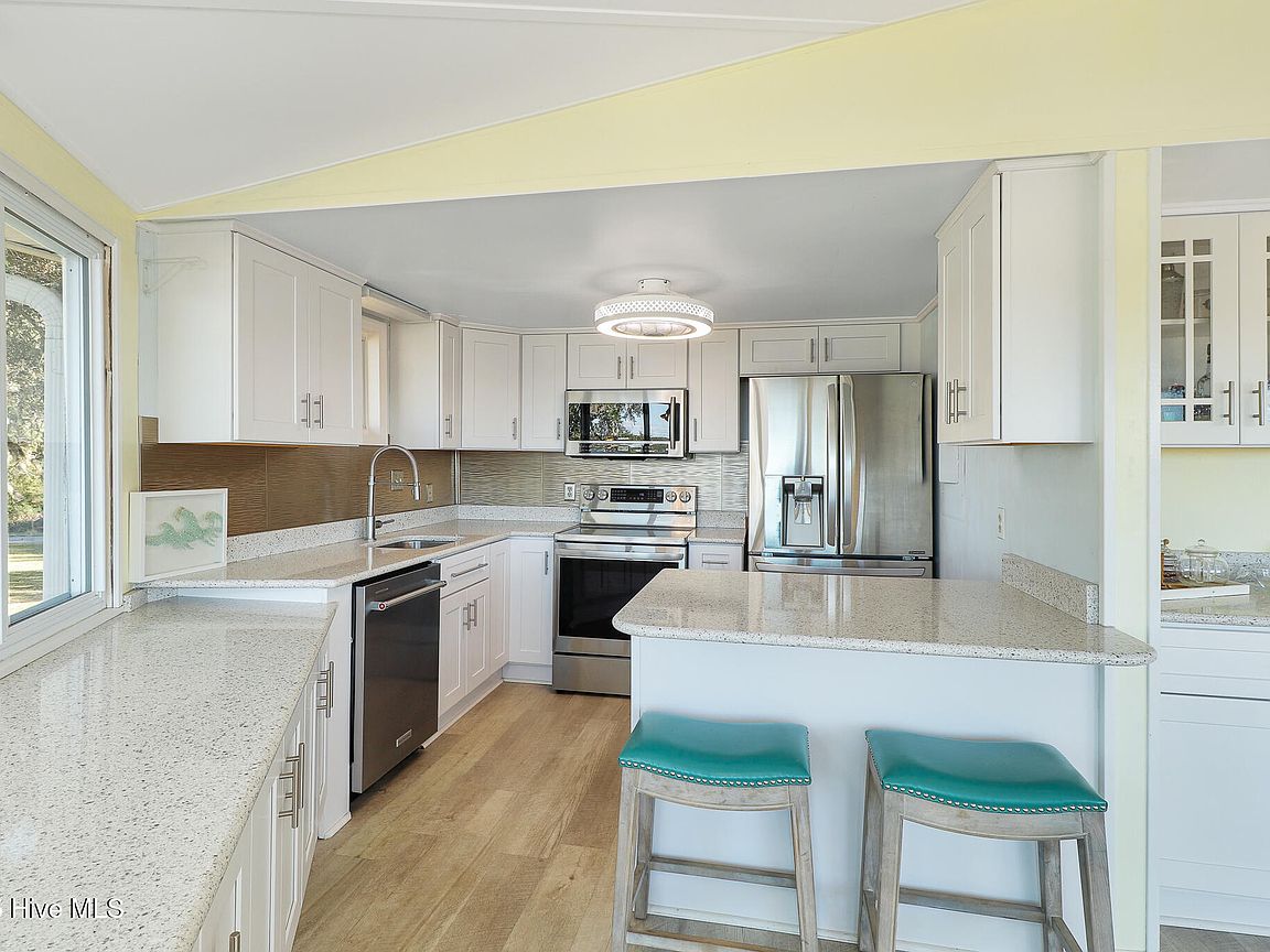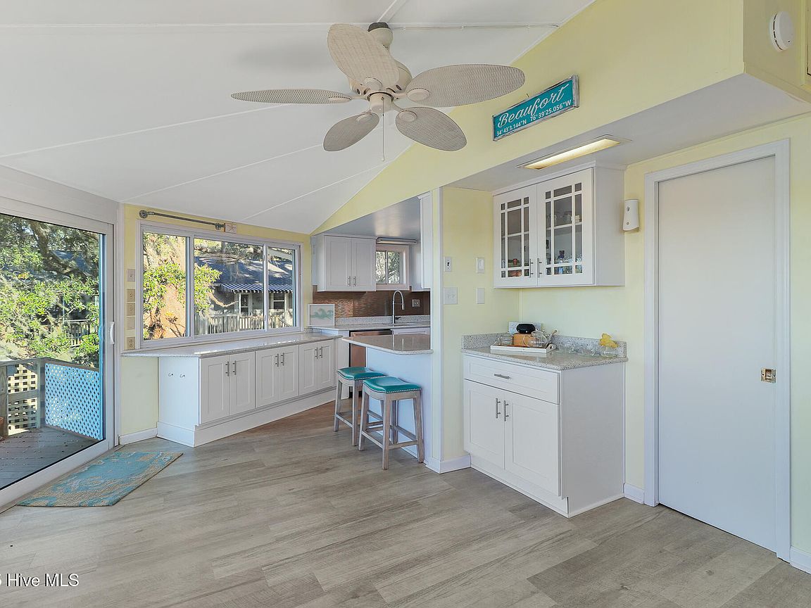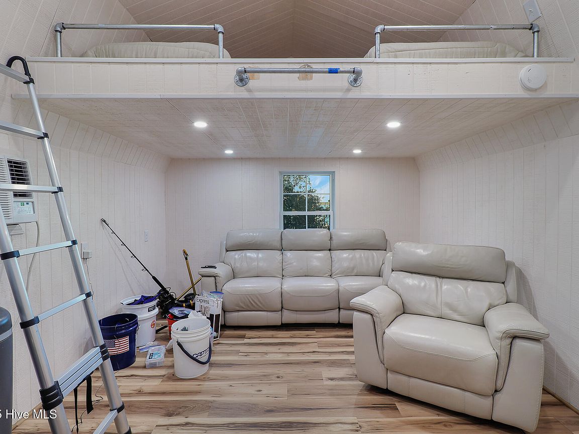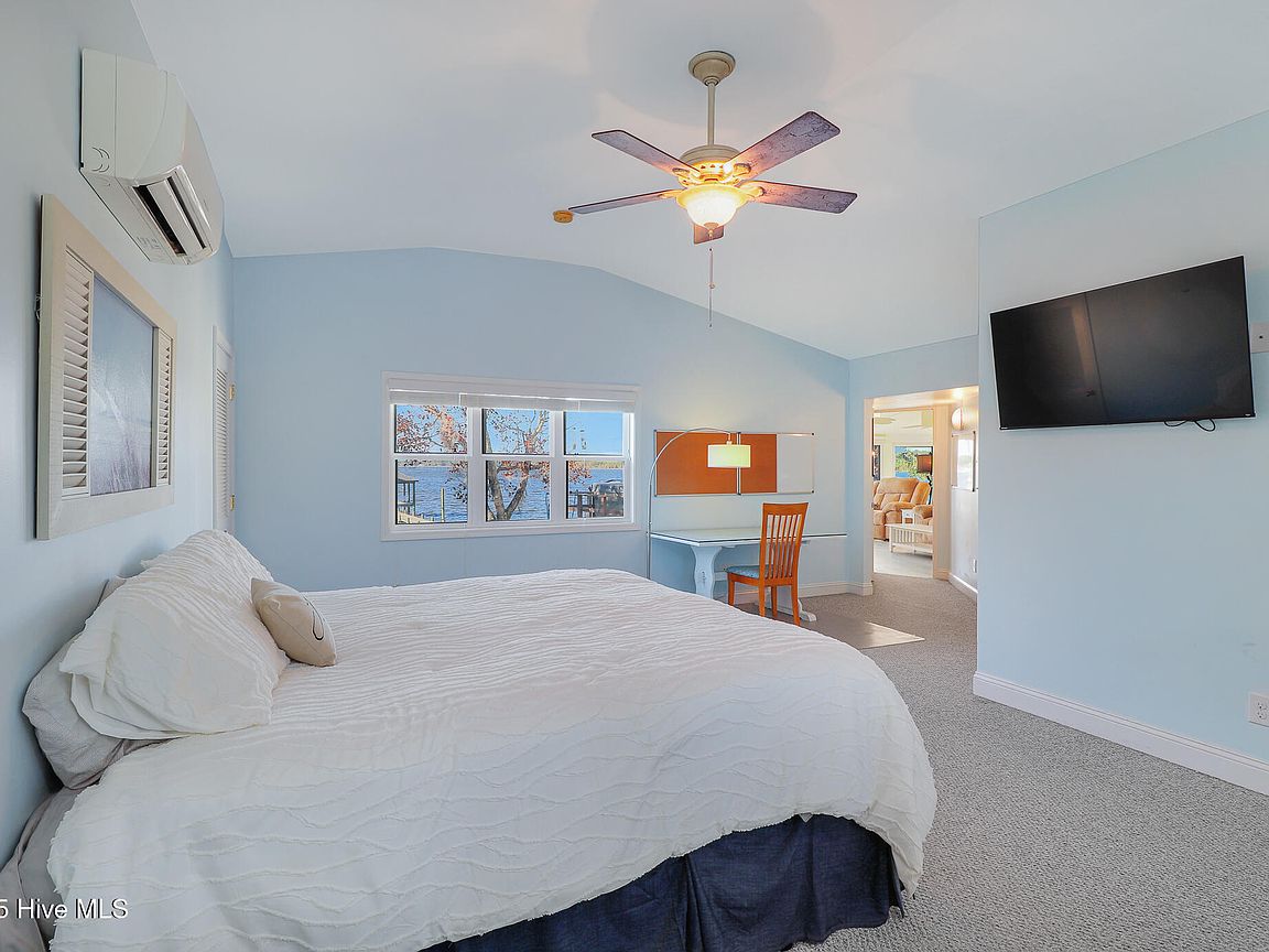 Tucked along Adam's Creek, 221 Creek Rd is a one-of-a-kind waterfront retreat designed to maximize natural light and the beauty of the coast. The home's distinctive dodecagon shape, reverse floor plan, vaulted ceilings, and walls of windows capture panoramic water views from nearly every room, creating a bright, open feel that changes with the light throughout the day. The updated kitchen features quartz countertops, stainless steel appliances, a coffee bar, and a walk-in pantry—all perfectly arranged for easy entertaining and everyday living and flows to the dining and living areas. The primary suite is privately set apart in its own wing, complete with a spacious walk-in closet and ensuite bath. The lower level offers a flexible layout, opening to a flex room, ideal for guests or recreation, complete with laundry & storage closets. A jack-and-jill bath connects to a spacious, bright bedroom with sliding glass doors onto the deck and a gorgeous backyard. A storage shed with a finished loft is ideal for guests, a studio, or home office. Both the house and finished shed are heated/cooled with mini-splits. Outdoor living takes center stage with the wraparound porch, gorgeous backyard, & water access. Relax in the hot tub on the porch overlooking the sunset, seek shade in the covered deck below, or roast marshmallows over the stone firepit on the water's edge. Take advantage of the boat ramp and private dock with two boat lifts—one covered (13,000 lb) and one currently set up for two jet skis (8,000 lb). The dock also features a covered pavilion with a dock box, ceiling fan, and porch swing, ideal for soaking in the water views and watching boats cruise along the ICW. Set amongst beautiful live oak trees, this unique home feels like a secluded retreat. Truly one-of-a-kind and designed to make the most of every view and every moment on the water. Don't miss out on the opportunity to live the ideal coastal lifestyle, where life on the water is just beyond your doorste