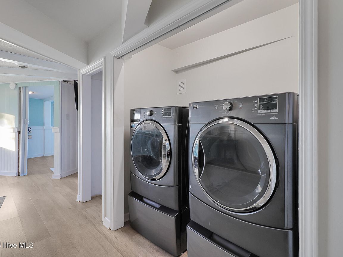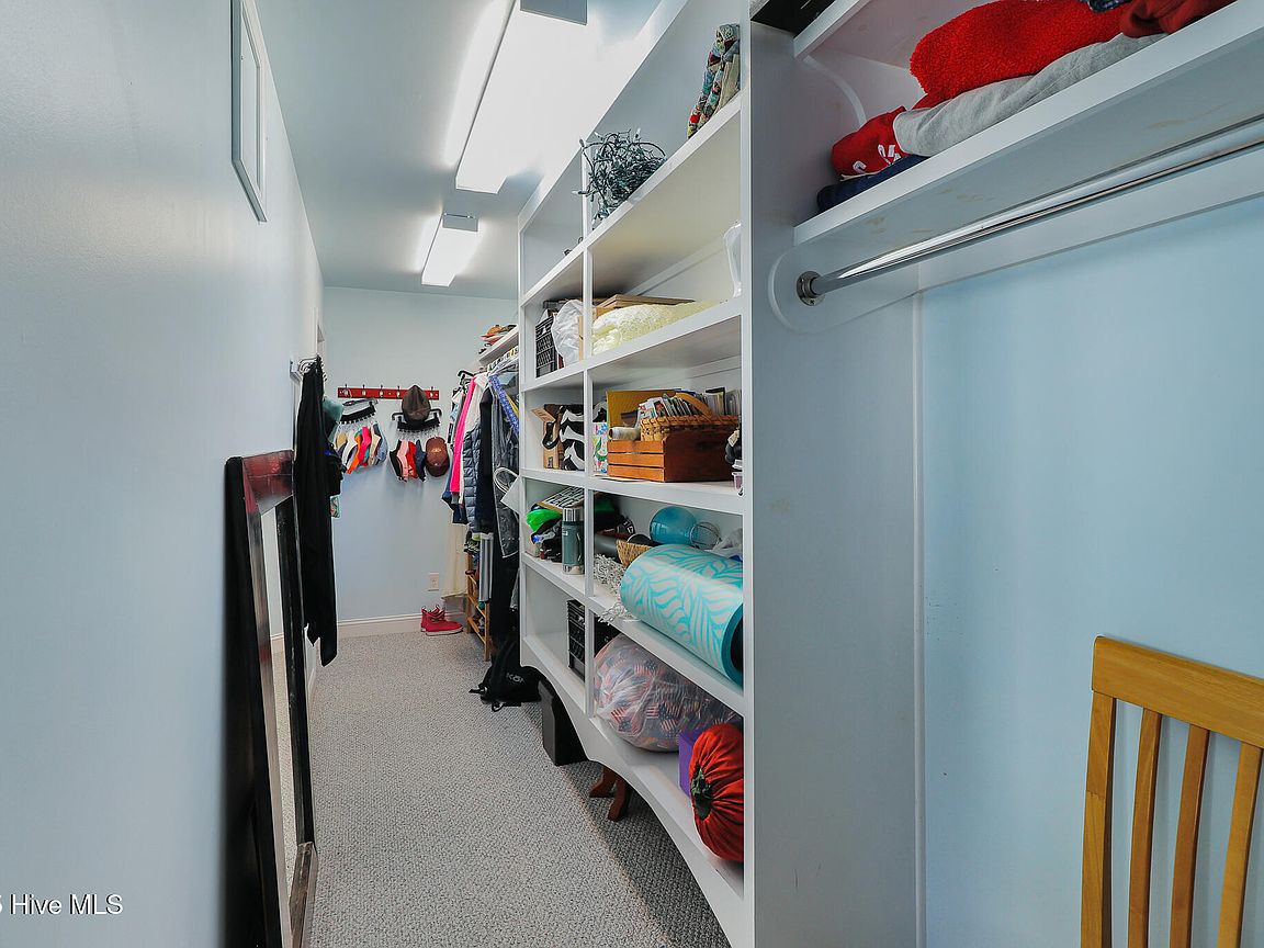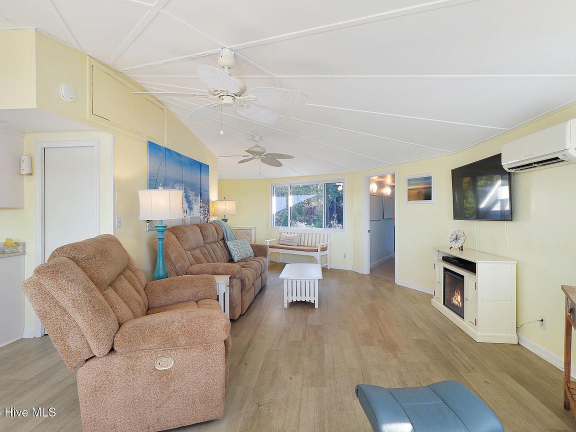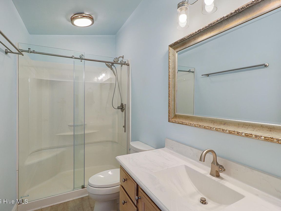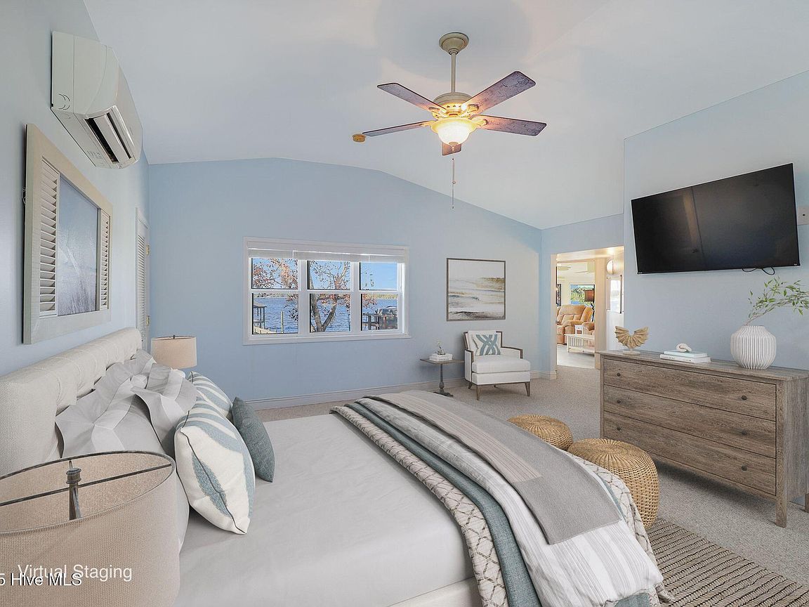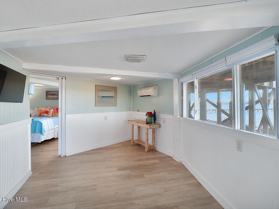 Tucked along Adam's Creek, 221 Creek Rd is a one-of-a-kind waterfront retreat designed to maximize natural light and the beauty of the coast. The home's distinctive dodecagon shape, reverse floor plan, vaulted ceilings, and walls of windows capture panoramic water views from nearly every room, creating a bright, open feel that changes with the light throughout the day. The updated kitchen features quartz countertops, stainless steel appliances, a coffee bar, and a walk-in pantry—all perfectly arranged for easy entertaining and everyday living and flows to the dining and living areas. The primary suite is privately set apart in its own wing, complete with a spacious walk-in closet and ensuite bath. The lower level offers a flexible layout, opening to a flex room, ideal for guests or recreation, complete with laundry & storage closets. A jack-and-jill bath connects to a spacious, bright bedroom with sliding glass doors onto the deck and a gorgeous backyard. A storage shed with a finished loft is ideal for guests, a studio, or home office. Both the house and finished shed are heated/cooled with mini-splits. Outdoor living takes center stage with the wraparound porch, gorgeous backyard, & water access. Relax in the hot tub on the porch overlooking the sunset, seek shade in the covered deck below, or roast marshmallows over the stone firepit on the water's edge. Take advantage of the boat ramp and private dock with two boat lifts—one covered (13,000 lb) and one currently set up for two jet skis (8,000 lb). The dock also features a covered pavilion with a dock box, ceiling fan, and porch swing, ideal for soaking in the water views and watching boats cruise along the ICW. Set amongst beautiful live oak trees, this unique home feels like a secluded retreat. Truly one-of-a-kind and designed to make the most of every view and every moment on the water. Don't miss out on the opportunity to live the ideal coastal lifestyle, where life on the water is just beyond your doorste